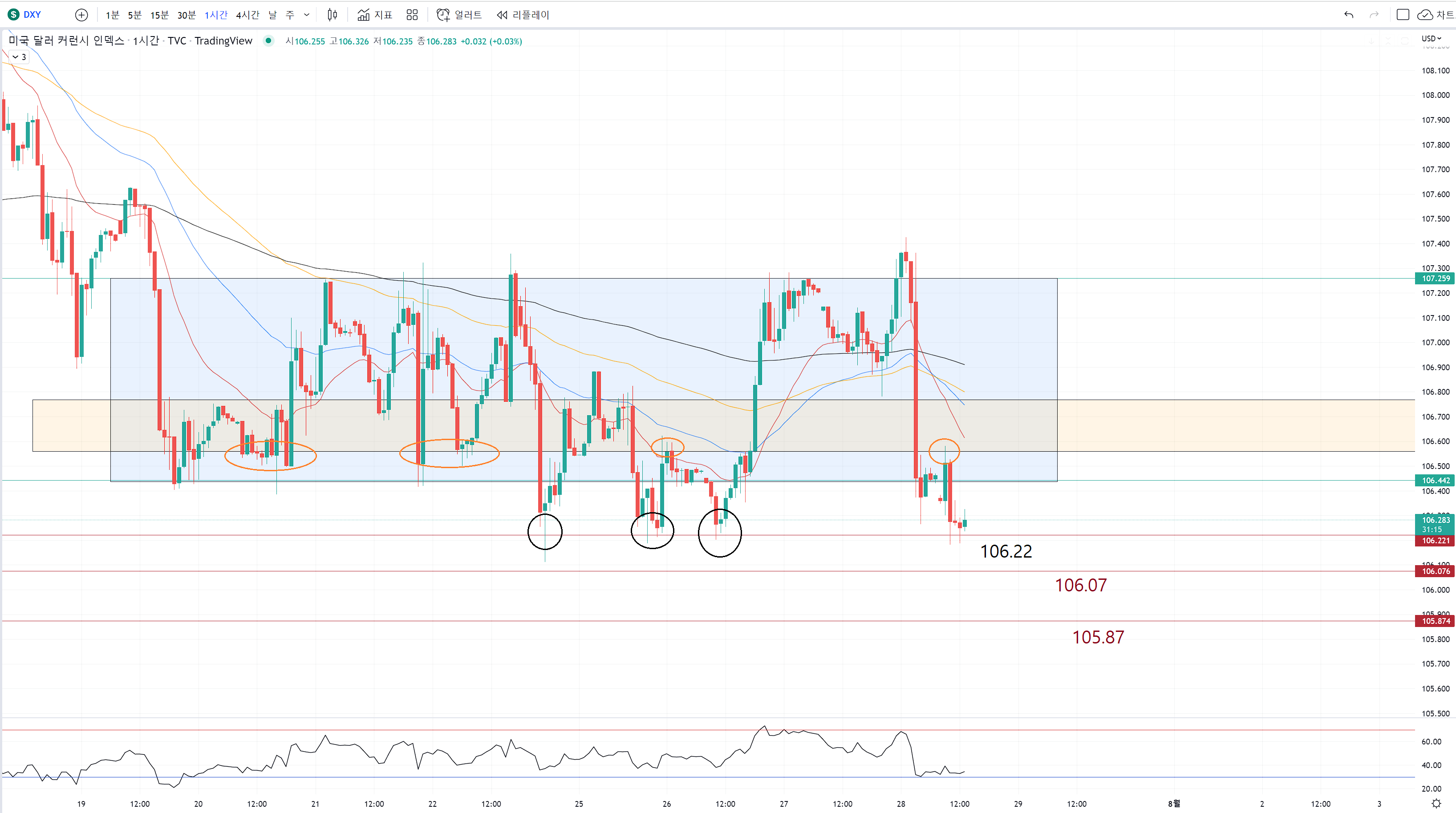 일단 106.22를 확실하게 무너뜨렸는데 106.07같은데서 반등을 해도 106.22에서 저항을 받는지