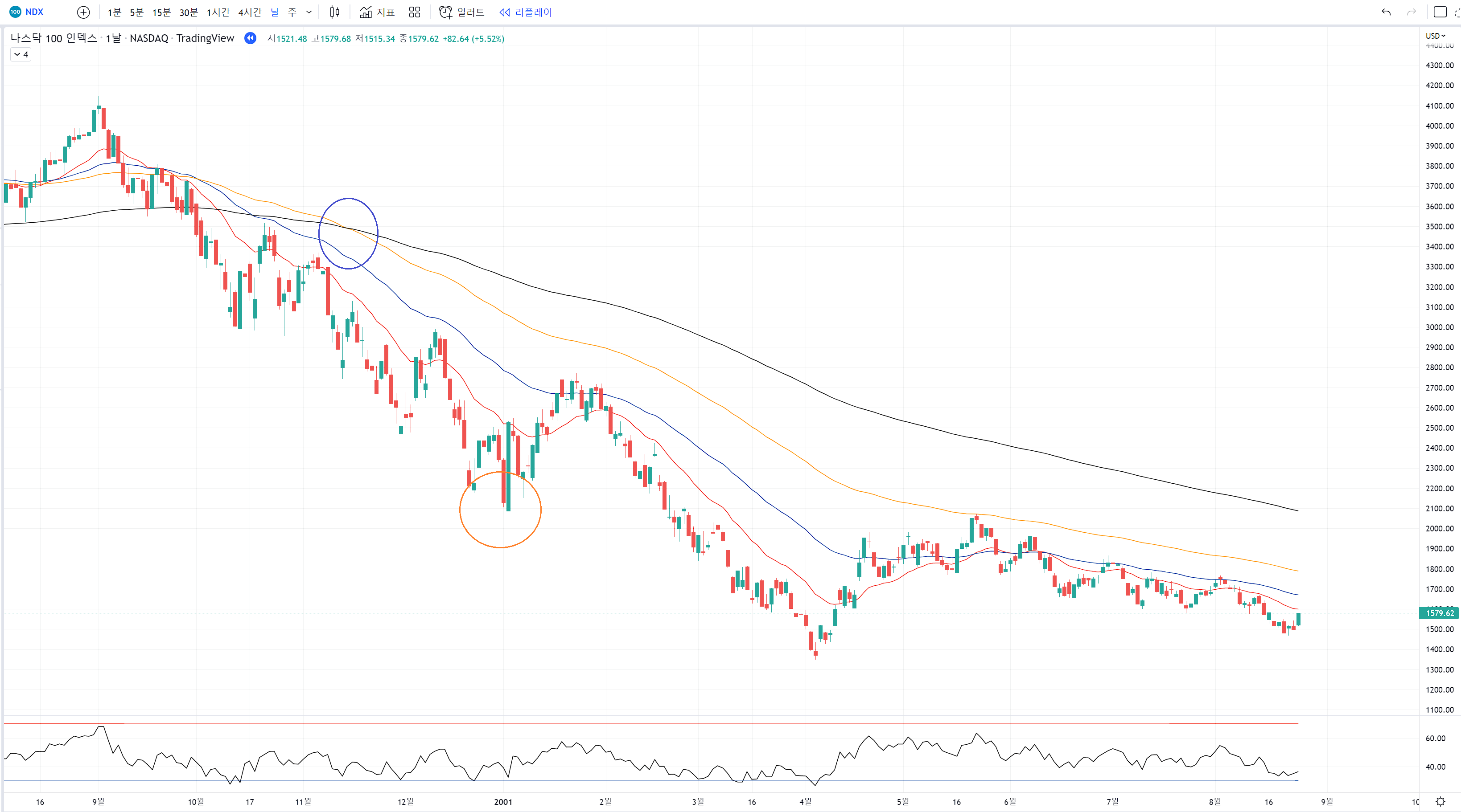 IT버블때는 예쁜역배열 반등에서 일봉 200일선도 터치 못하고 계속 하락만 나왔습니다.