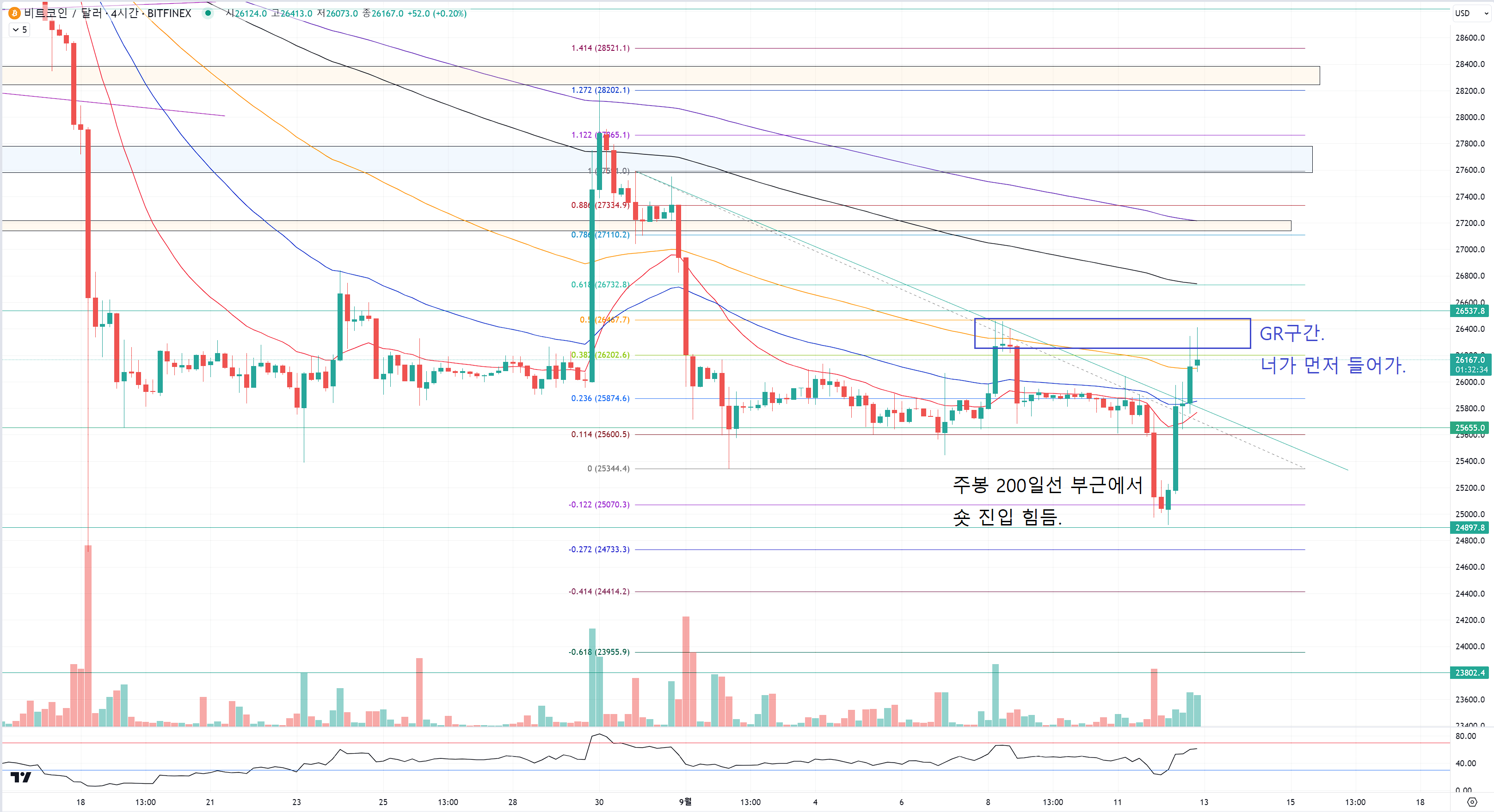 그리고 그렇게 이번에 밀리면 주봉 200일선은 확실하게 끊어 주겠다는 하락이 나올 확률이 높아요.