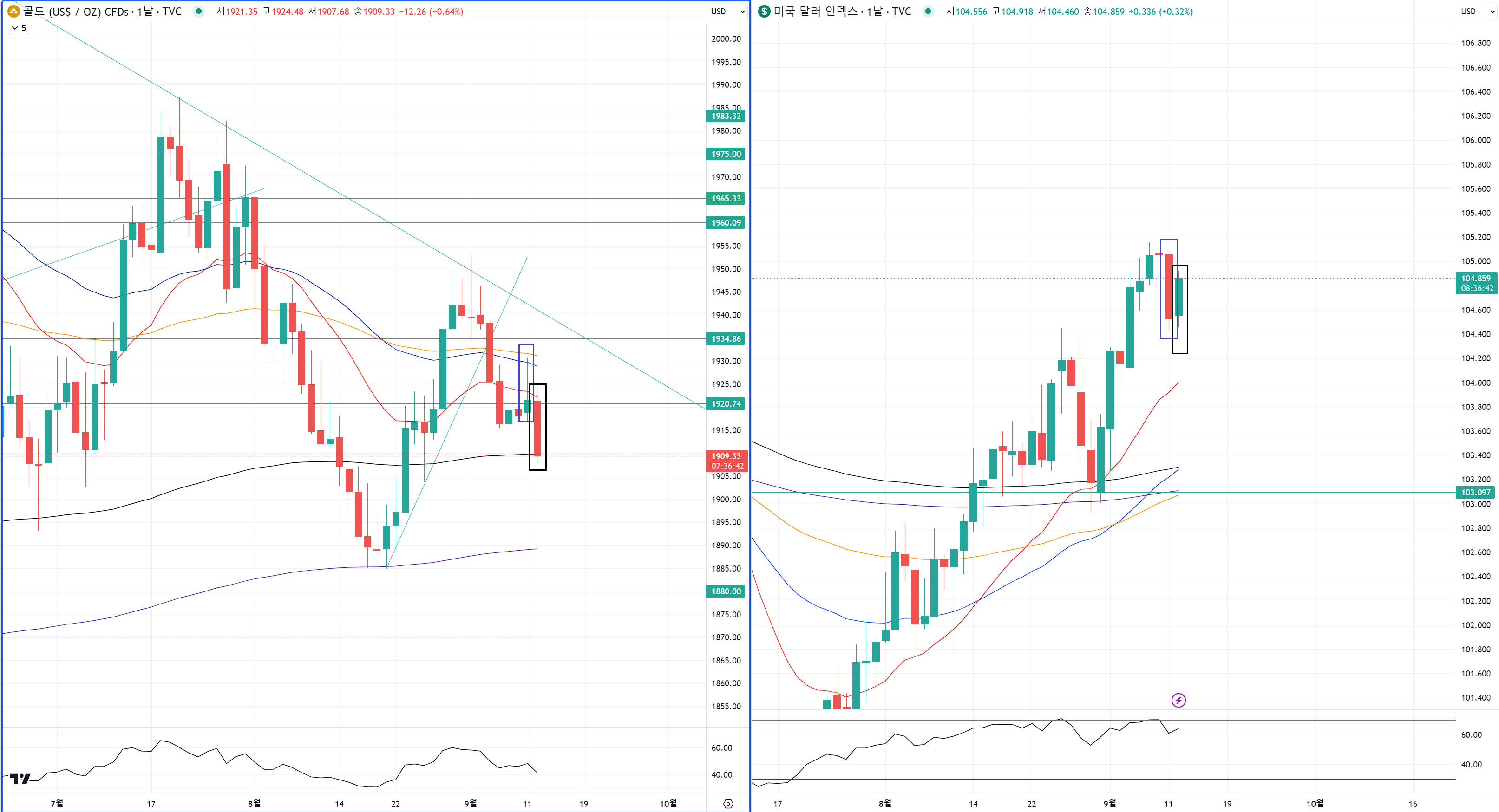 오늘 차트만 보면 금도 팔아치우고 달라 사버리는 듯한 모습이지만