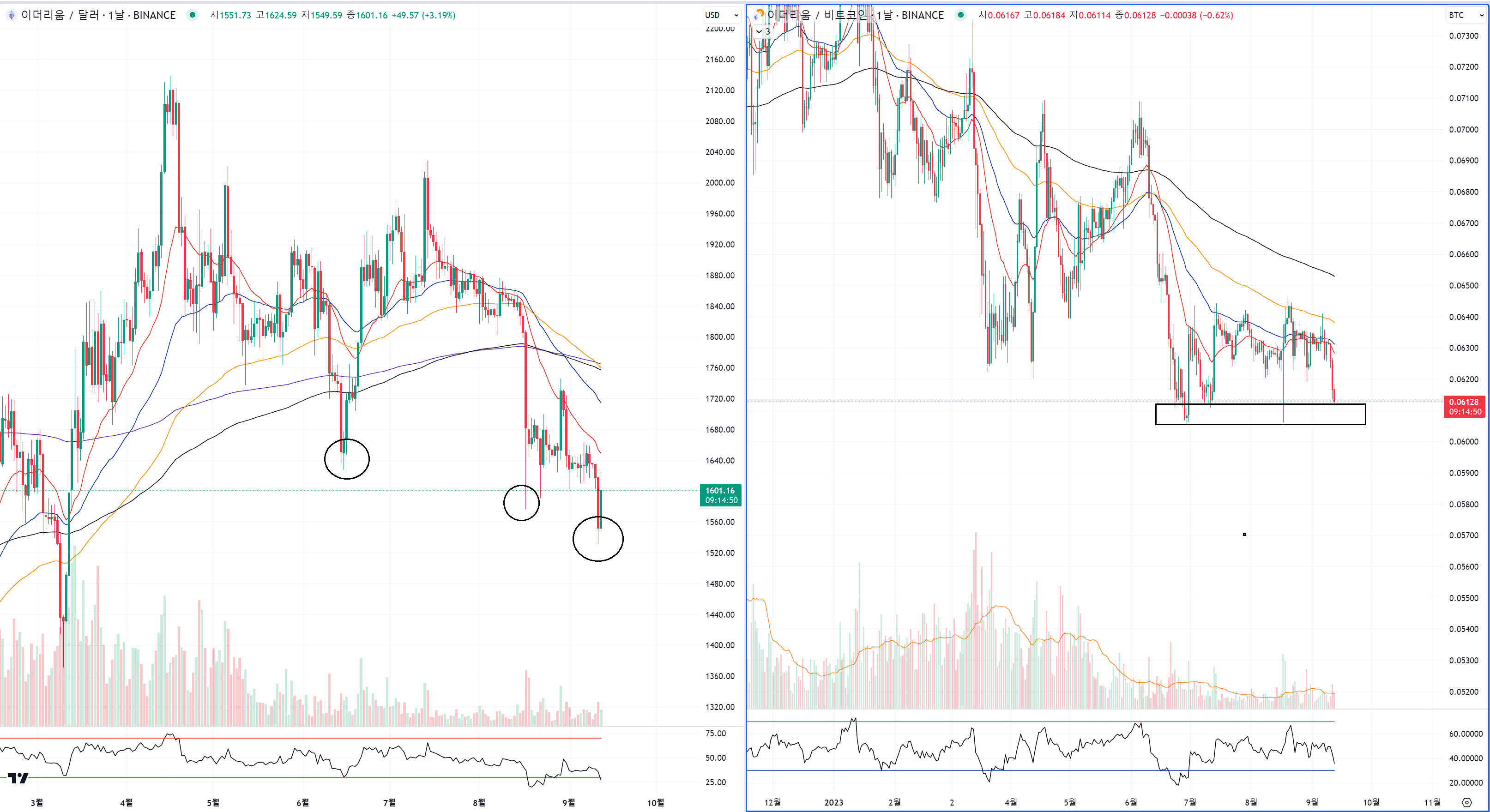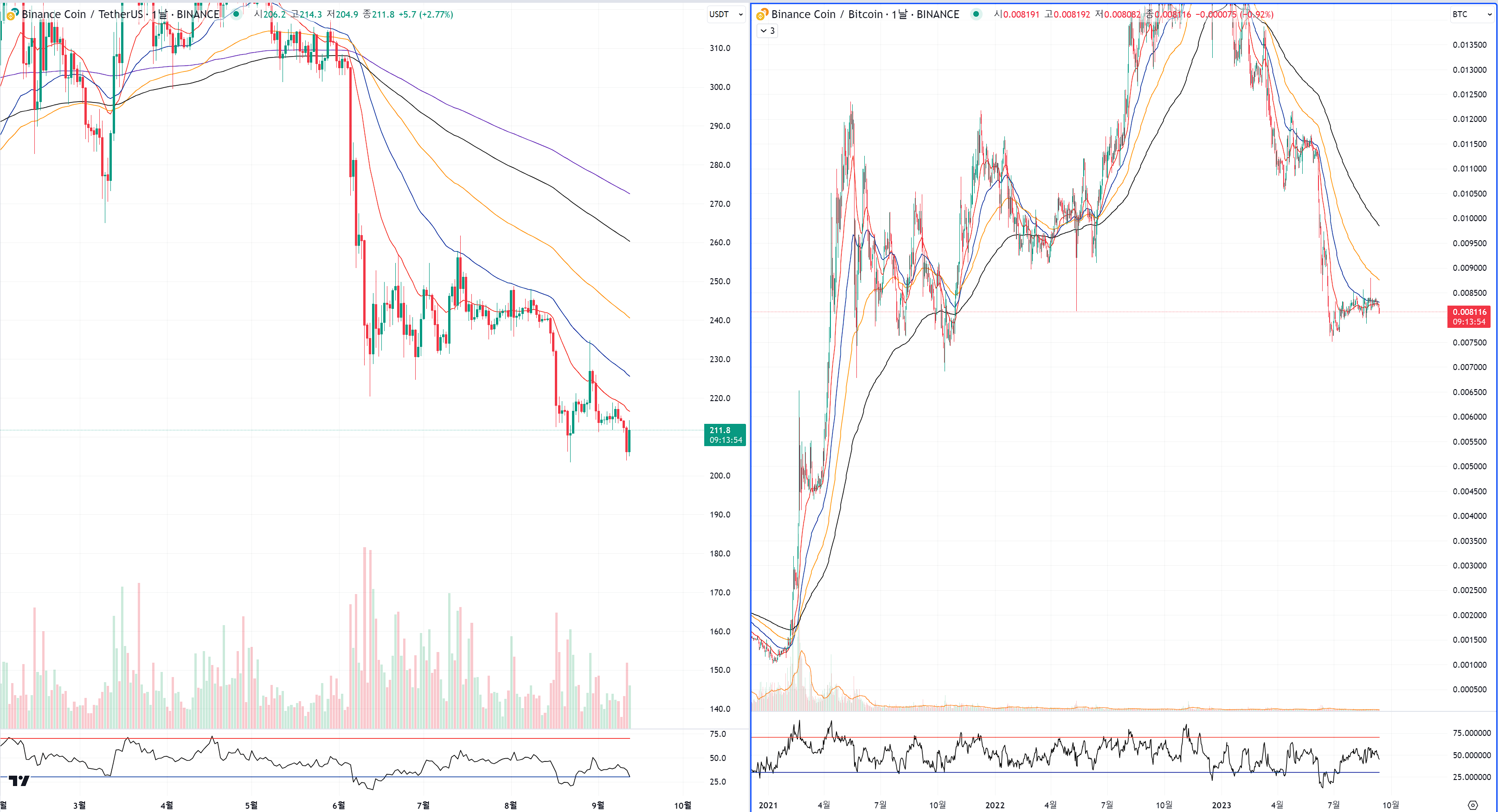 바이낸스 코인도 btc 차트쪽에서 무너지면 와르르 무너지기 딱 좋은 상황입니다.