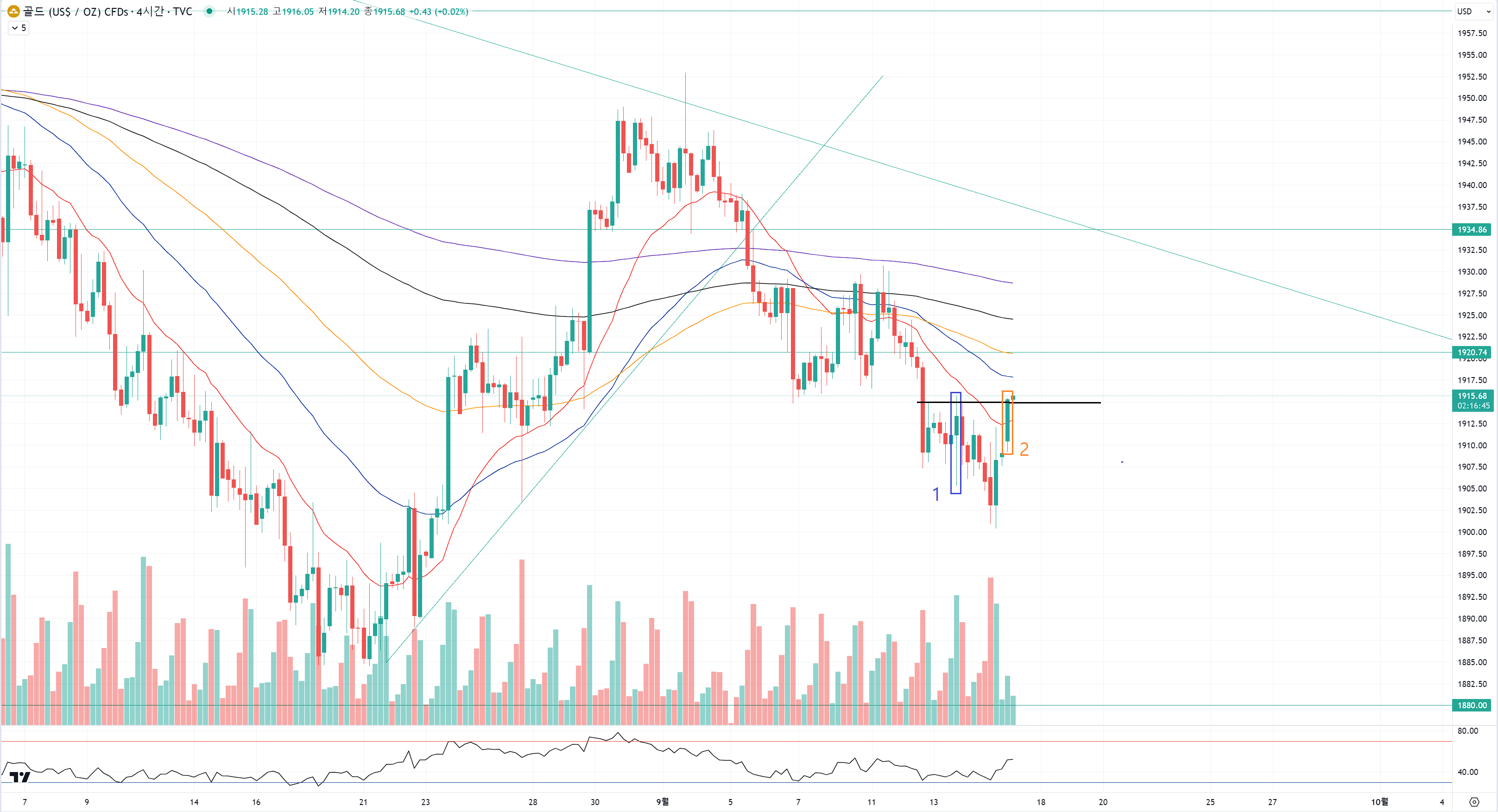 골드는 1번 파랑색 캔들을 보시면
