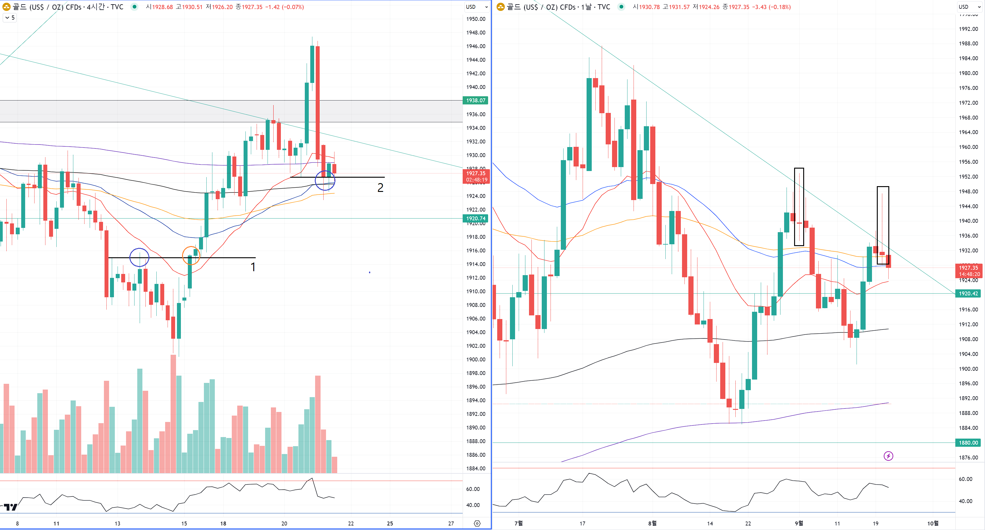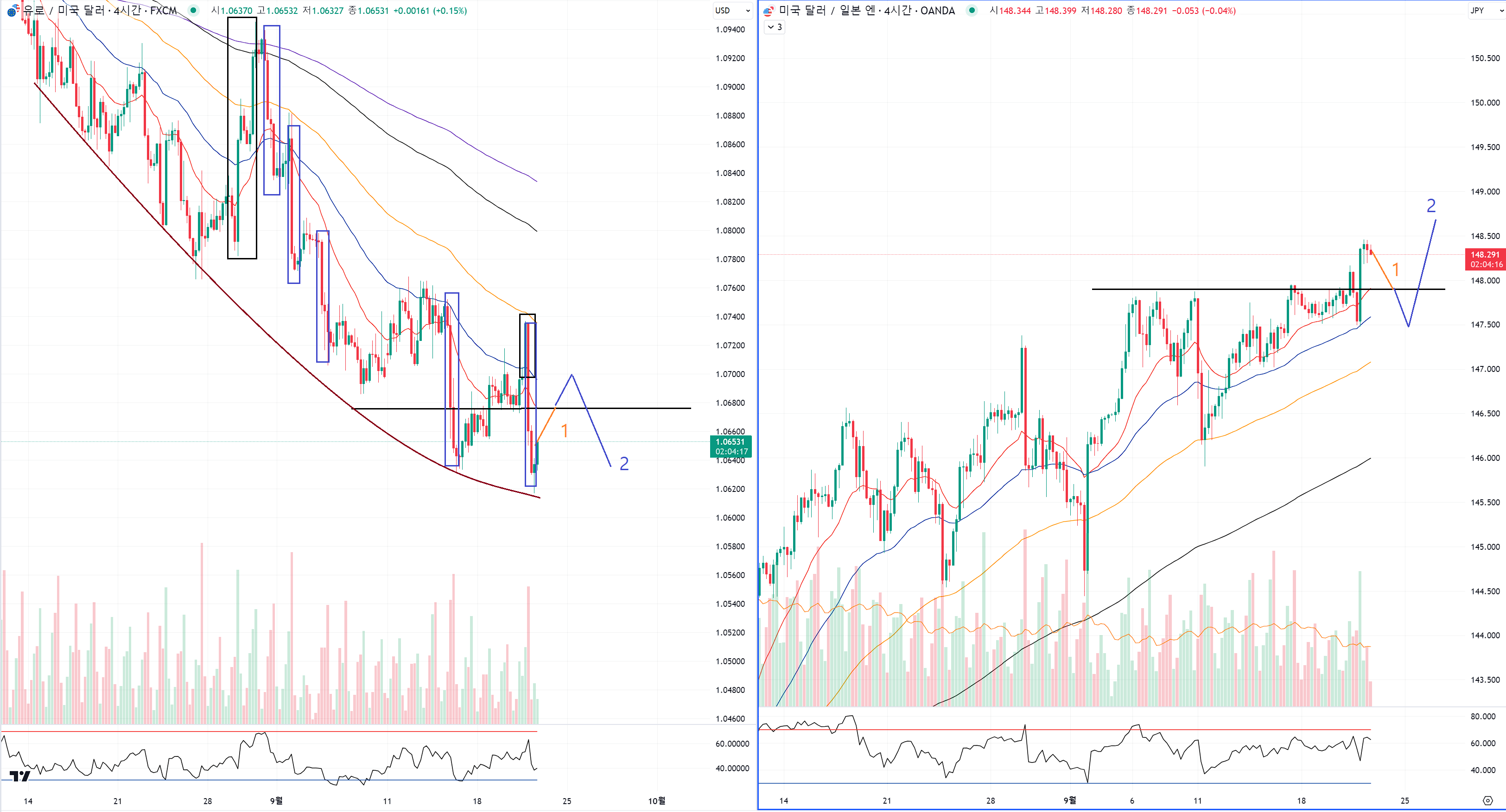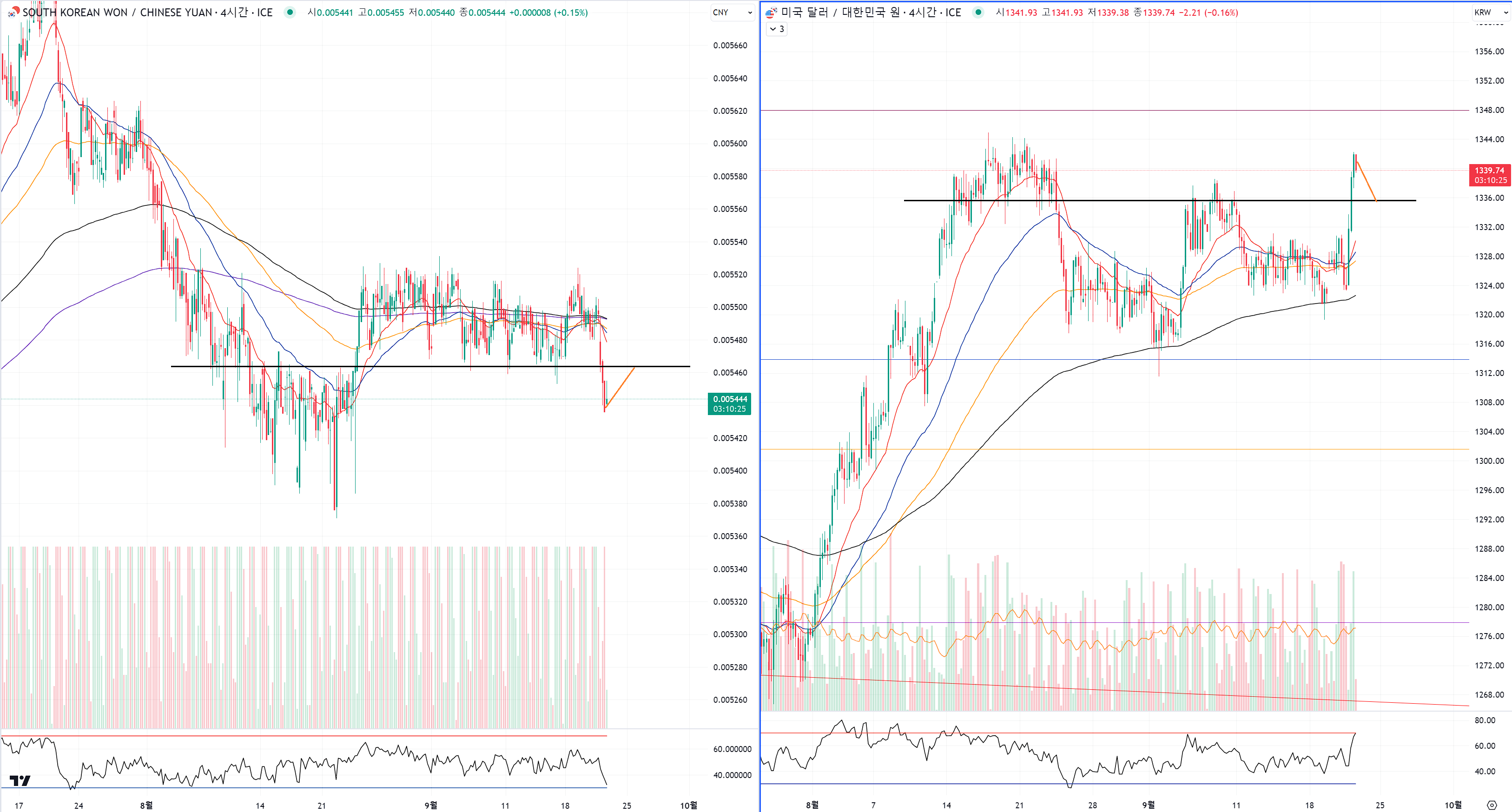 왼쪽은 4시간봉이고 오른쪽은 일봉이예요.