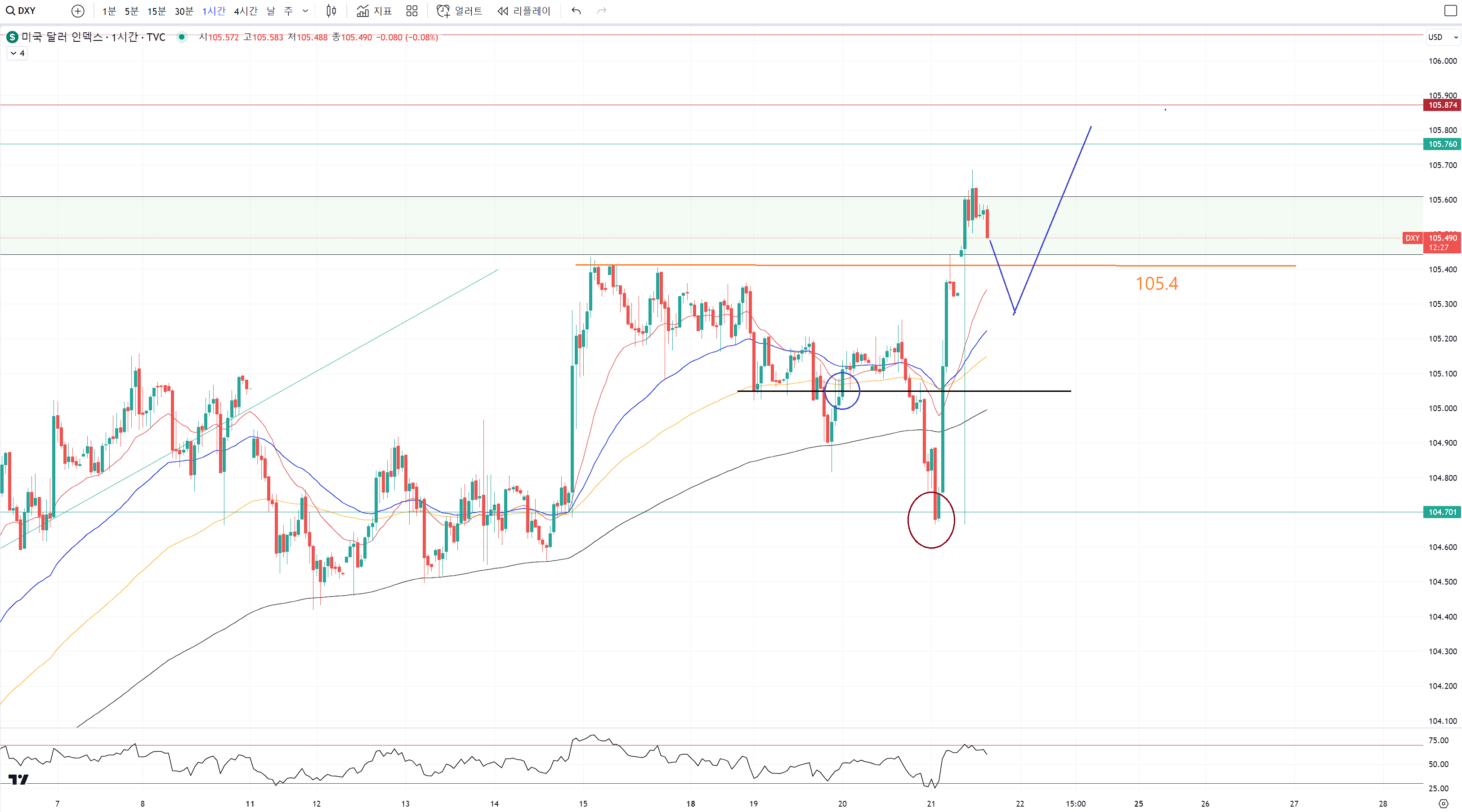 단기적으로 105.4라는 선이 중요해졌는데
