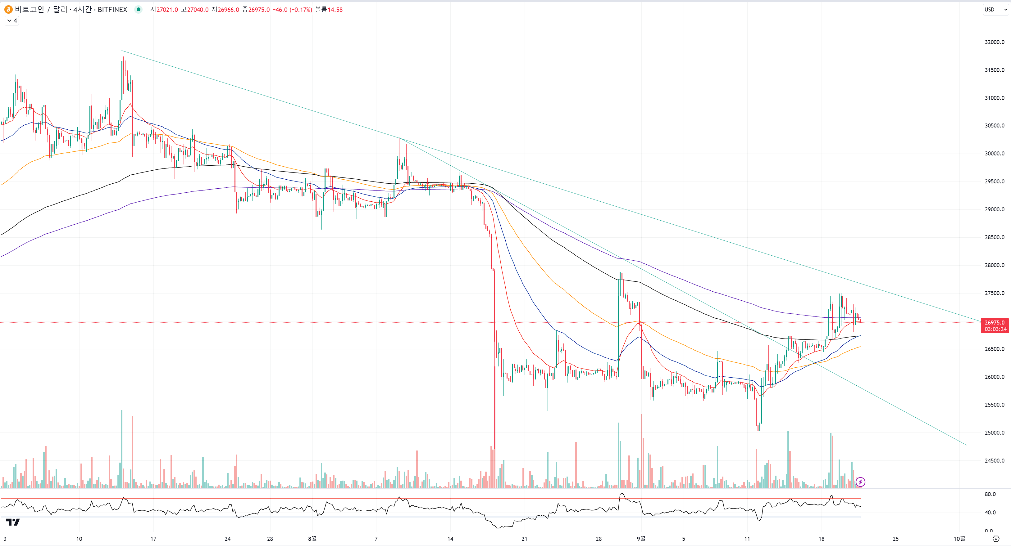 플래그 패턴을 완성해가며 정석적인 하락 추세를 만들어 주고 있습니다.
