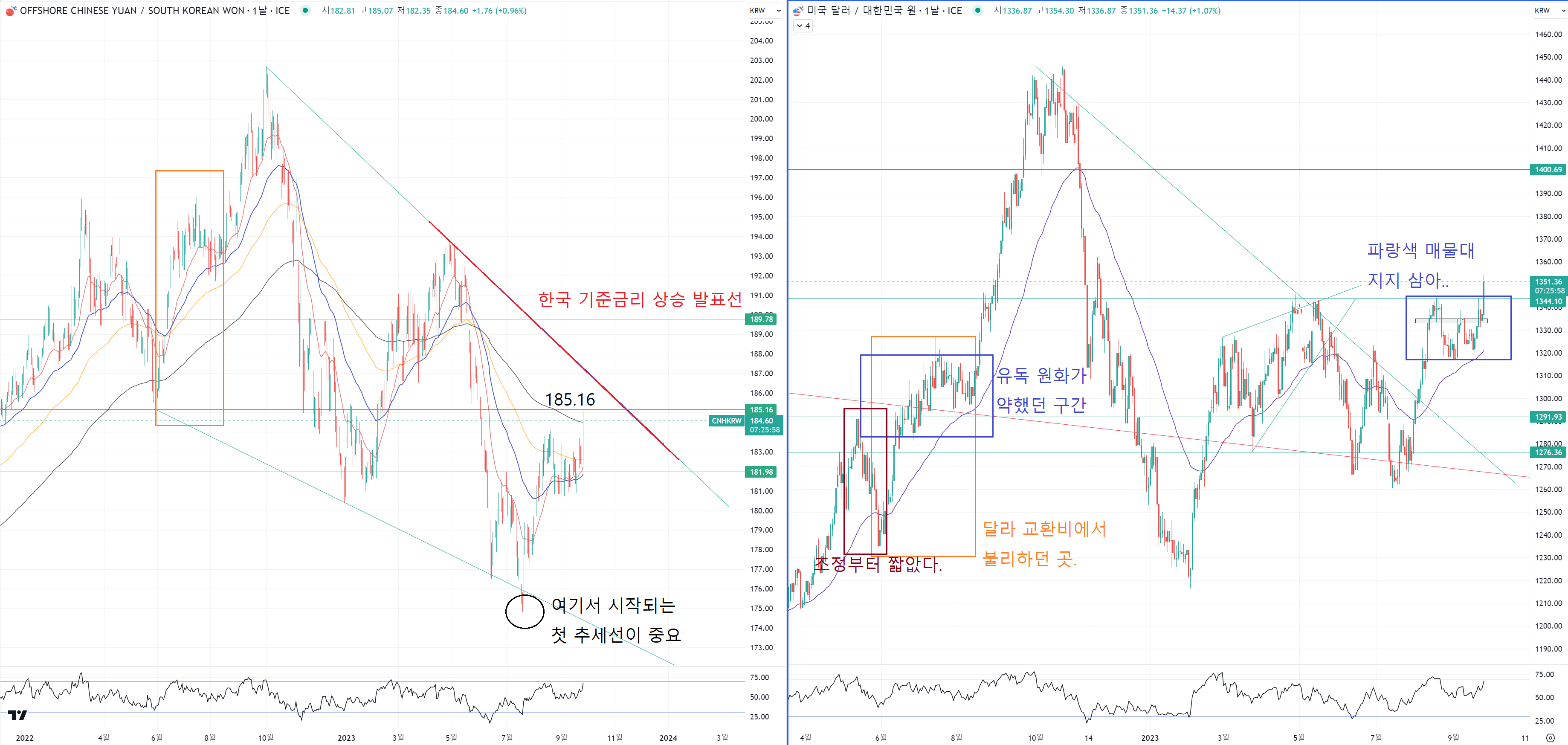 왼쪽은 위안원화 차트이고 오른쪽은 달라원화 차트입니다.