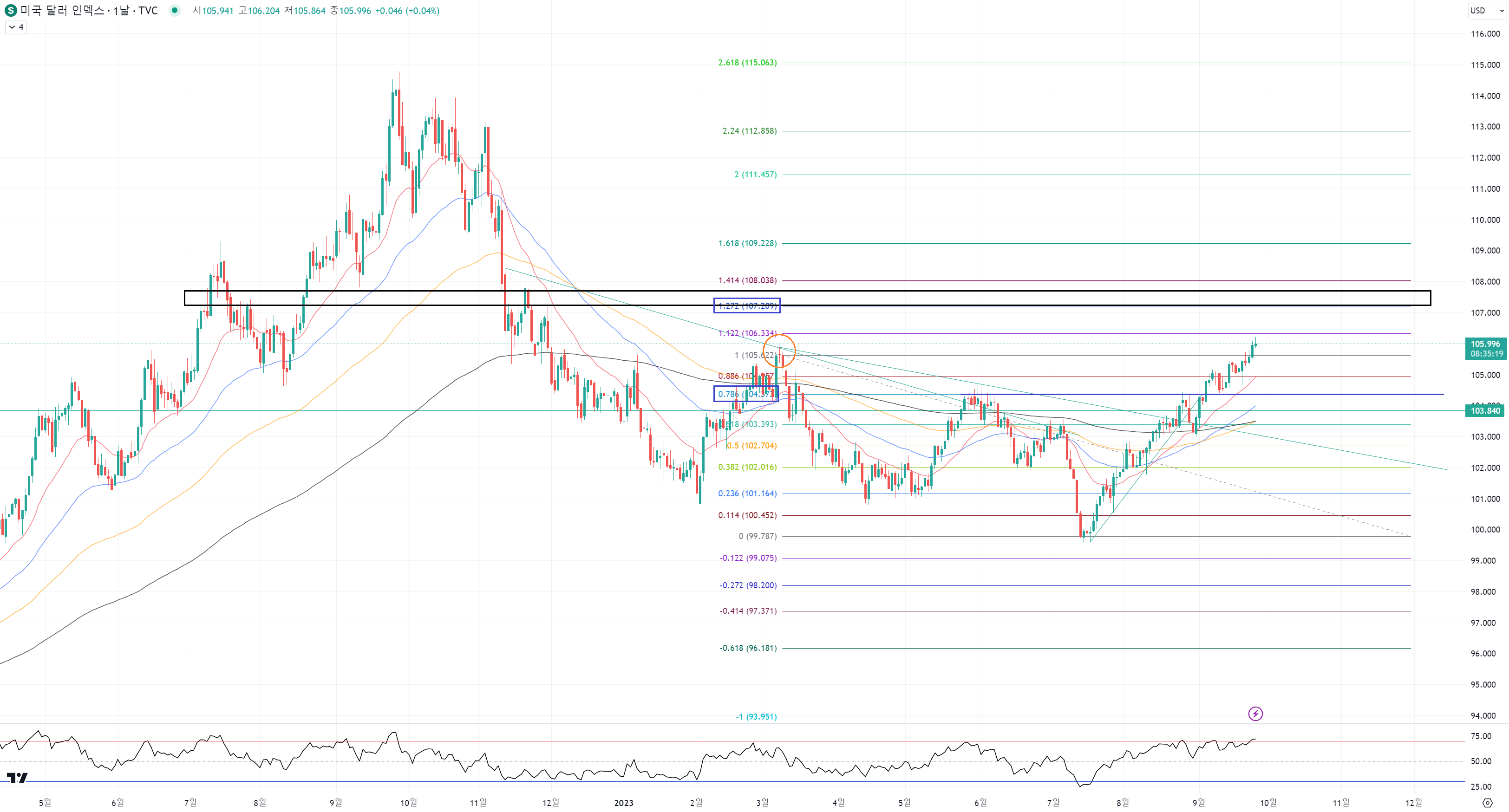 고점 갱신한김에 피보나치 비율 되돌림과 저항지점인 107 주변인 검은색구간까지 갈지 어떨지야 모르겠지만