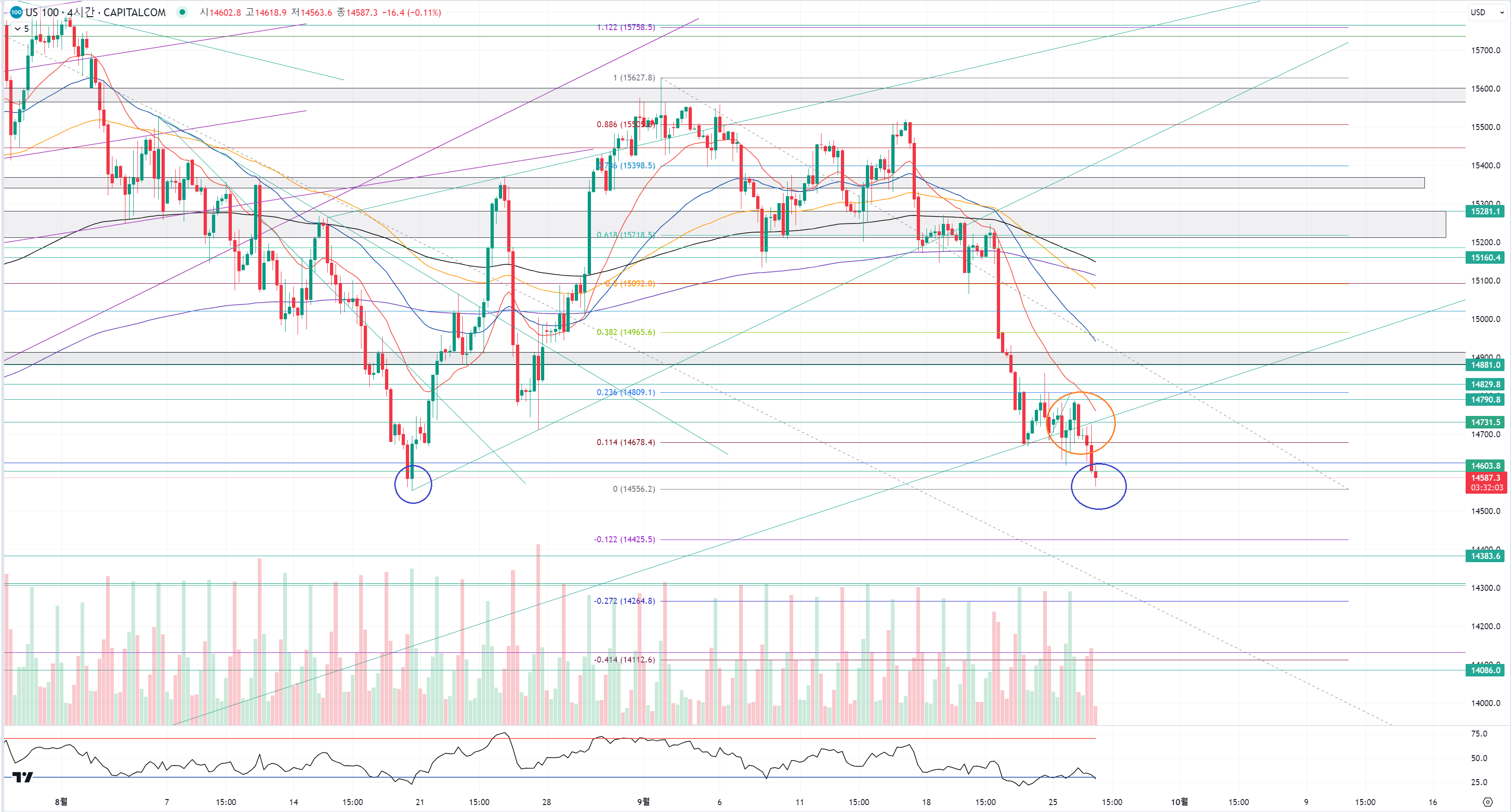 파랑색 구간이 아니라 주황색 동그라미 저점 쌍바닥도 노려볼 수는 있어요.