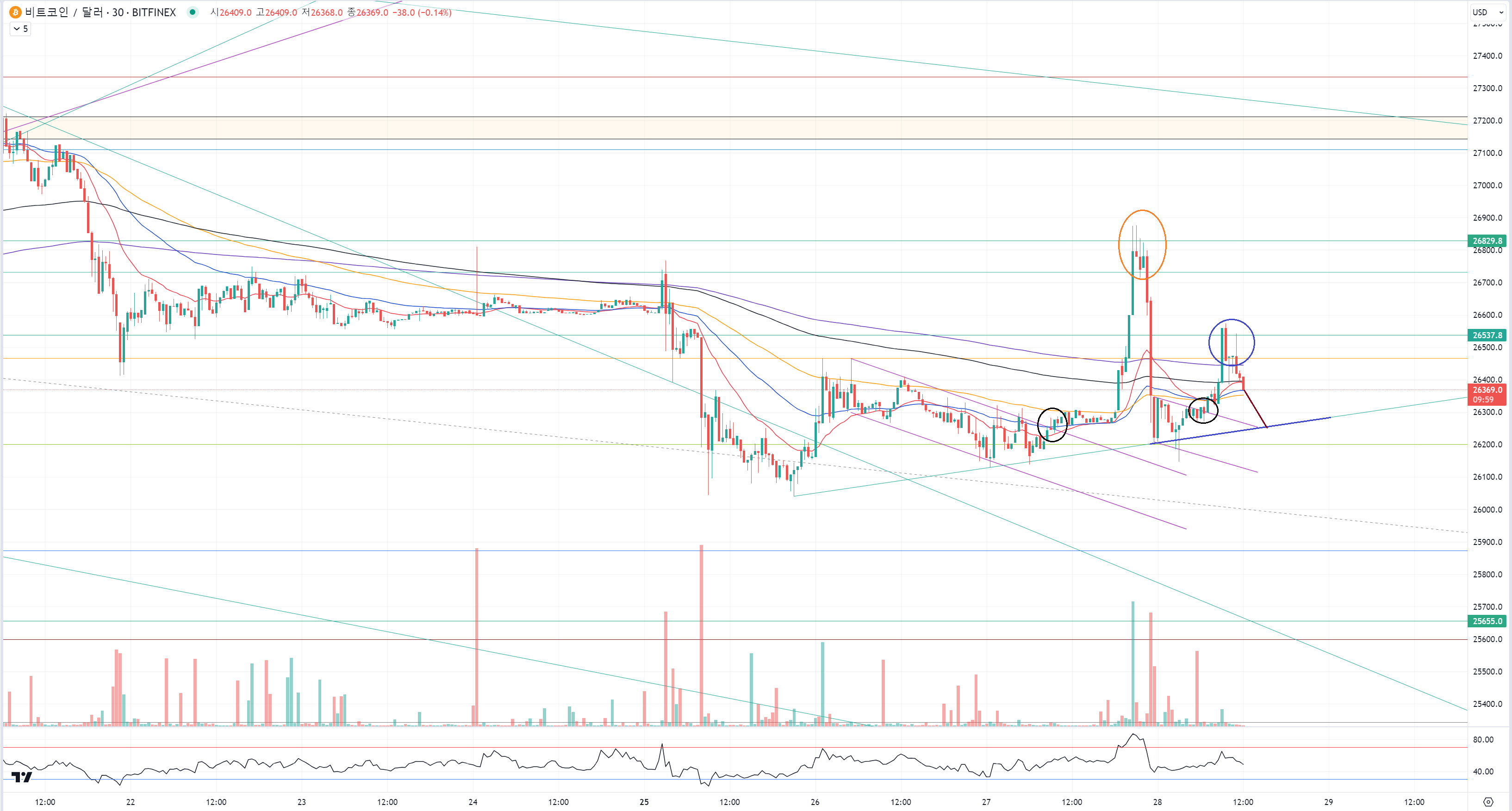 둘 다 하락추세선으로 하락쐐기형태를 만들며 전체적으로는 플래그패턴도 기대할 수 있는 상황이었는데