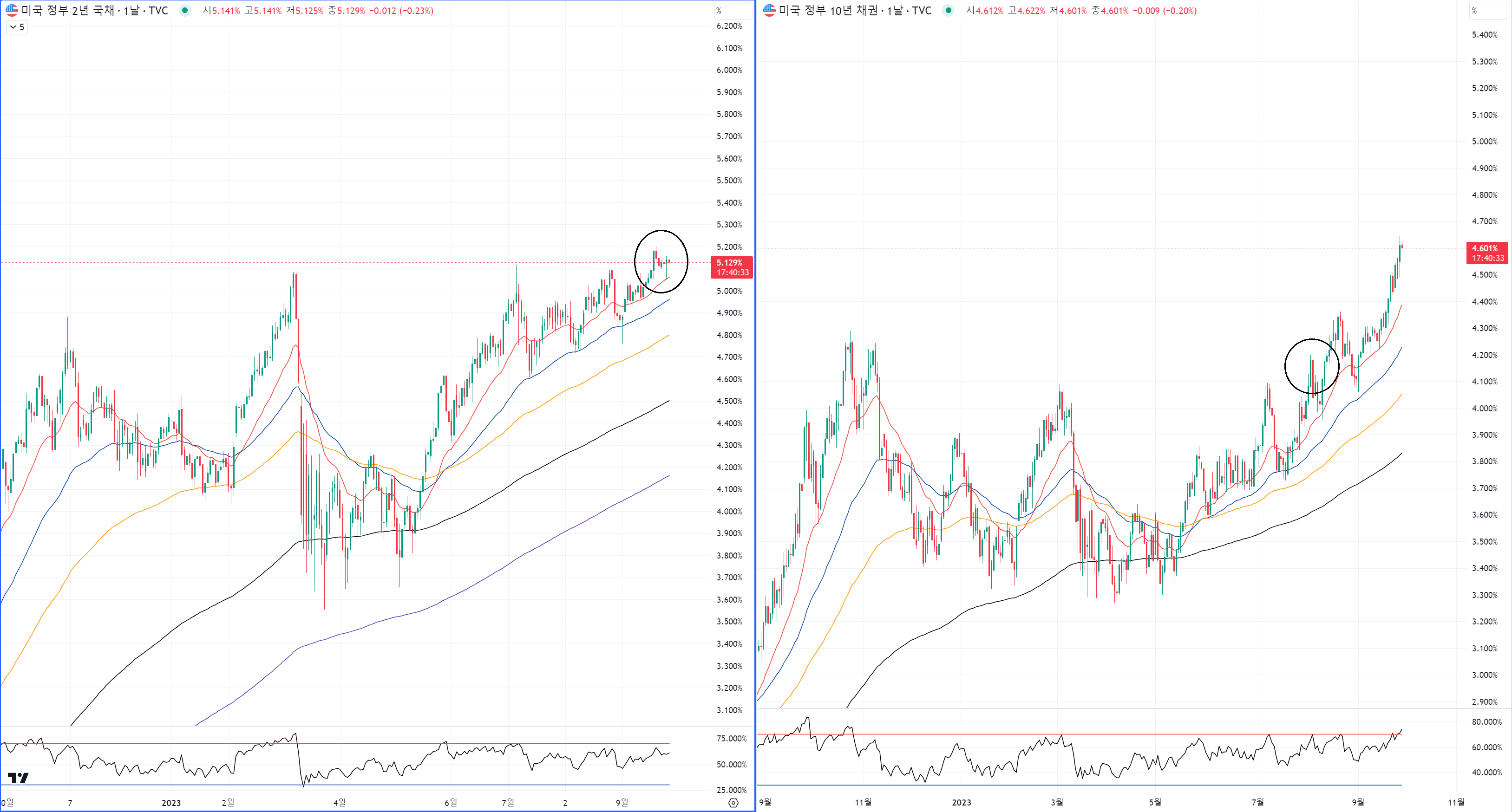 물론 이건 2년물에서 검은색 동그라미인 2023년 최고점 갱신을 앞두고 저항이 계속 나와서인데