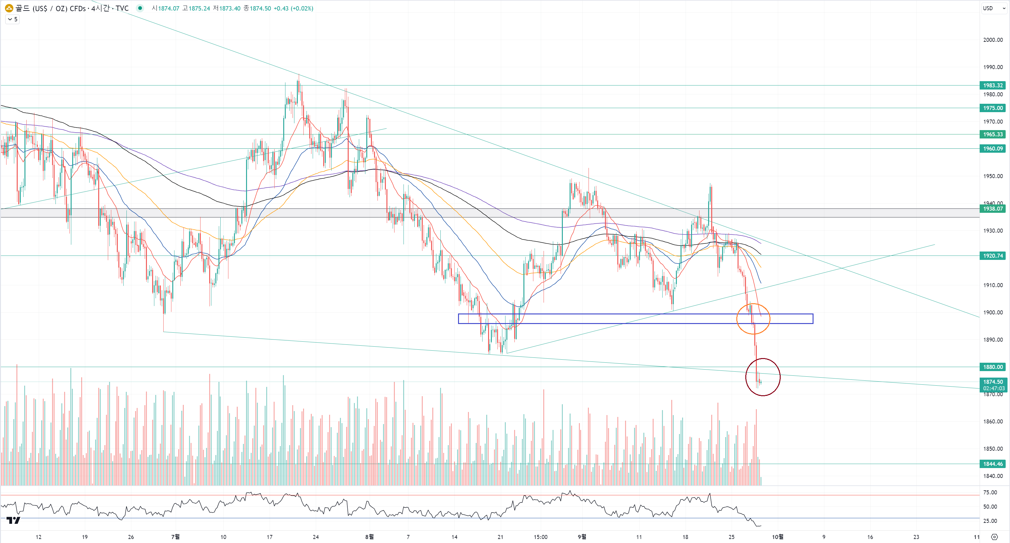 골드의 경우 주황색 동그라미에서 파랑색 지지 구간에서 살짝 멈추더니 쉽게 무너졌습니다.