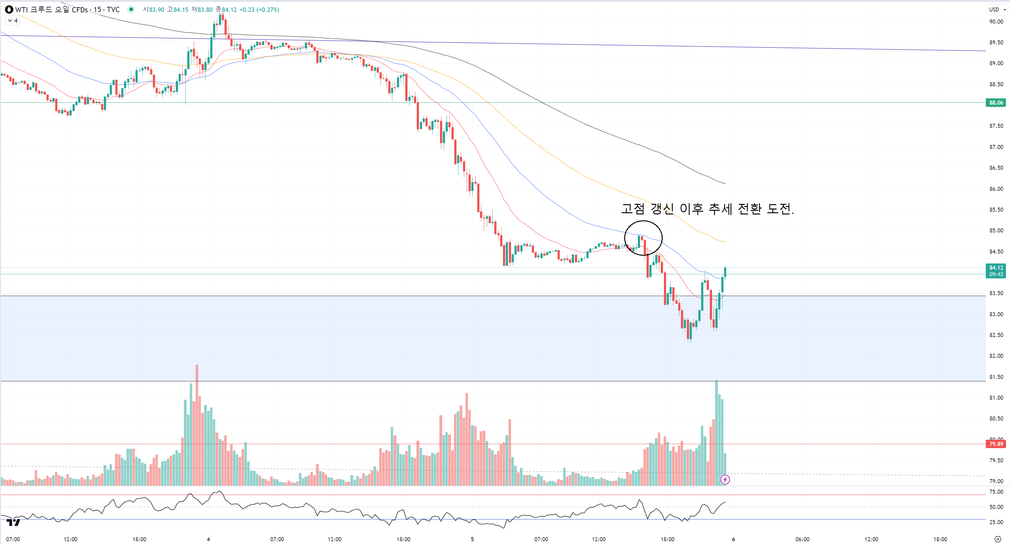 15분봉에서 고점을 갱신하며 짧은 구간에서 추세전환을 시도 했습니다.