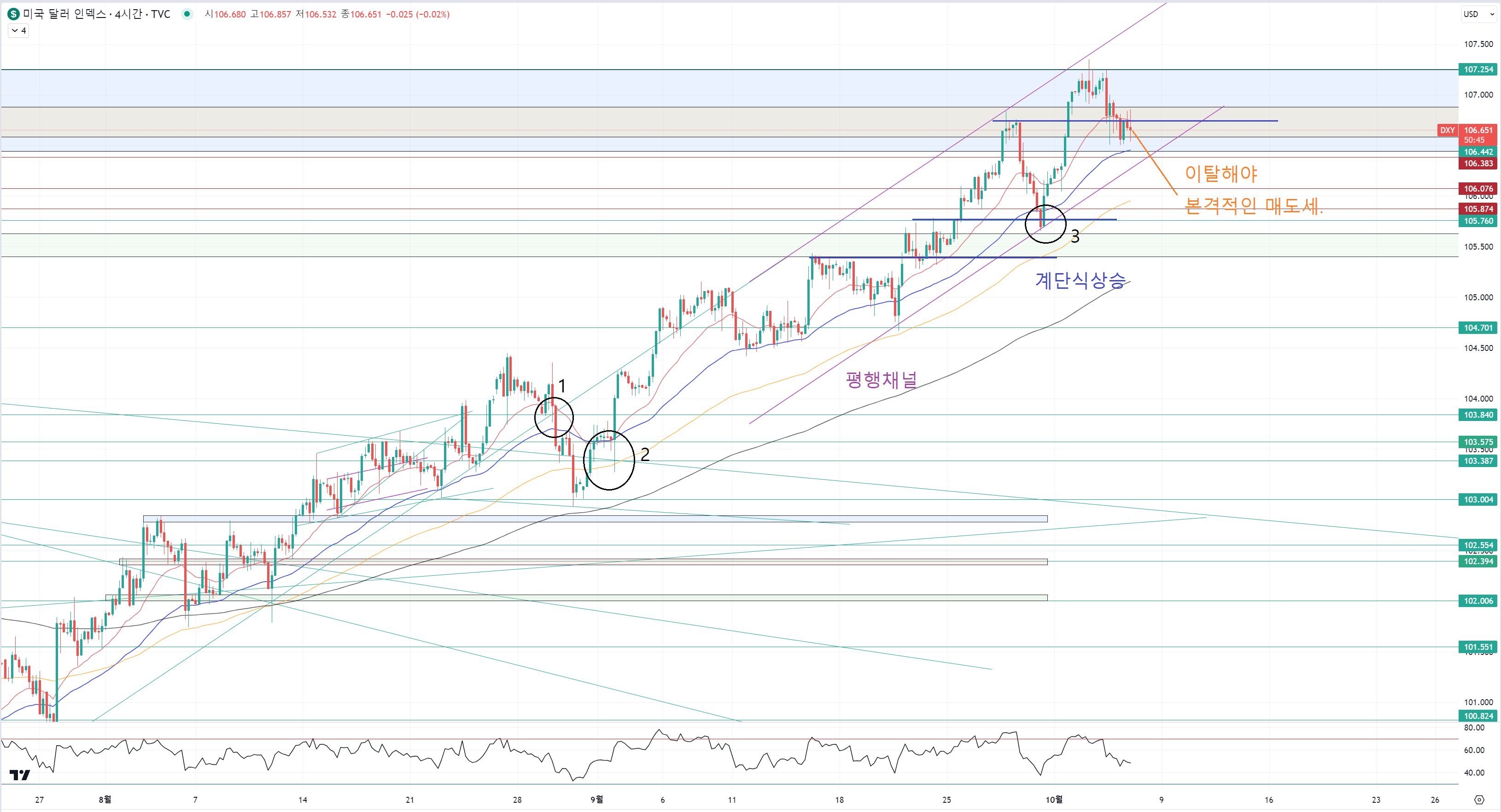 그랬던게 107 초반의 저항 구간에서 저항 받고 계단식 상승을 끝내줄지를 결정하는 것이 지금의 모습입니다.