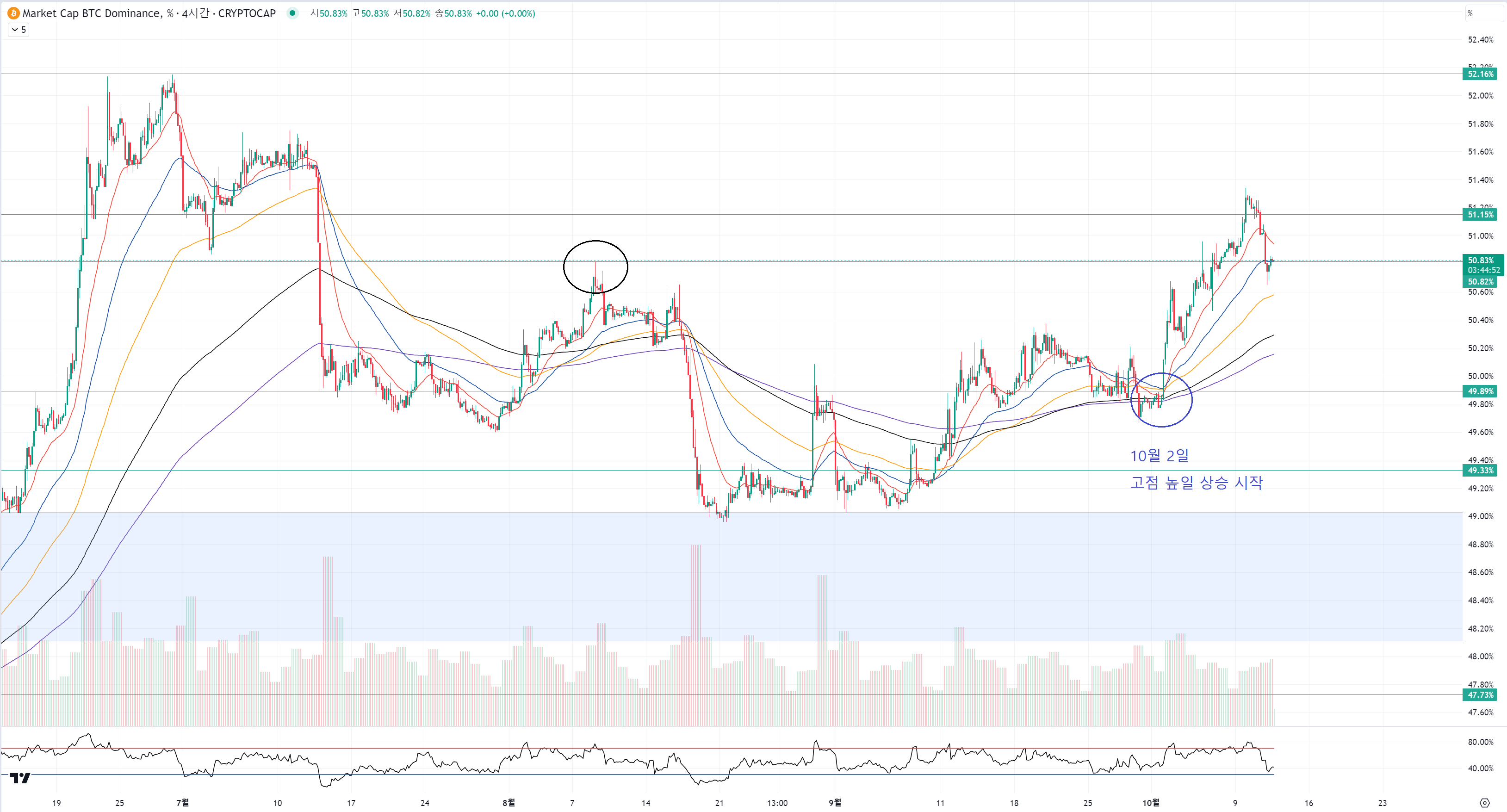 비트코인의 하락에서 도미넌스가 계속 상승했고