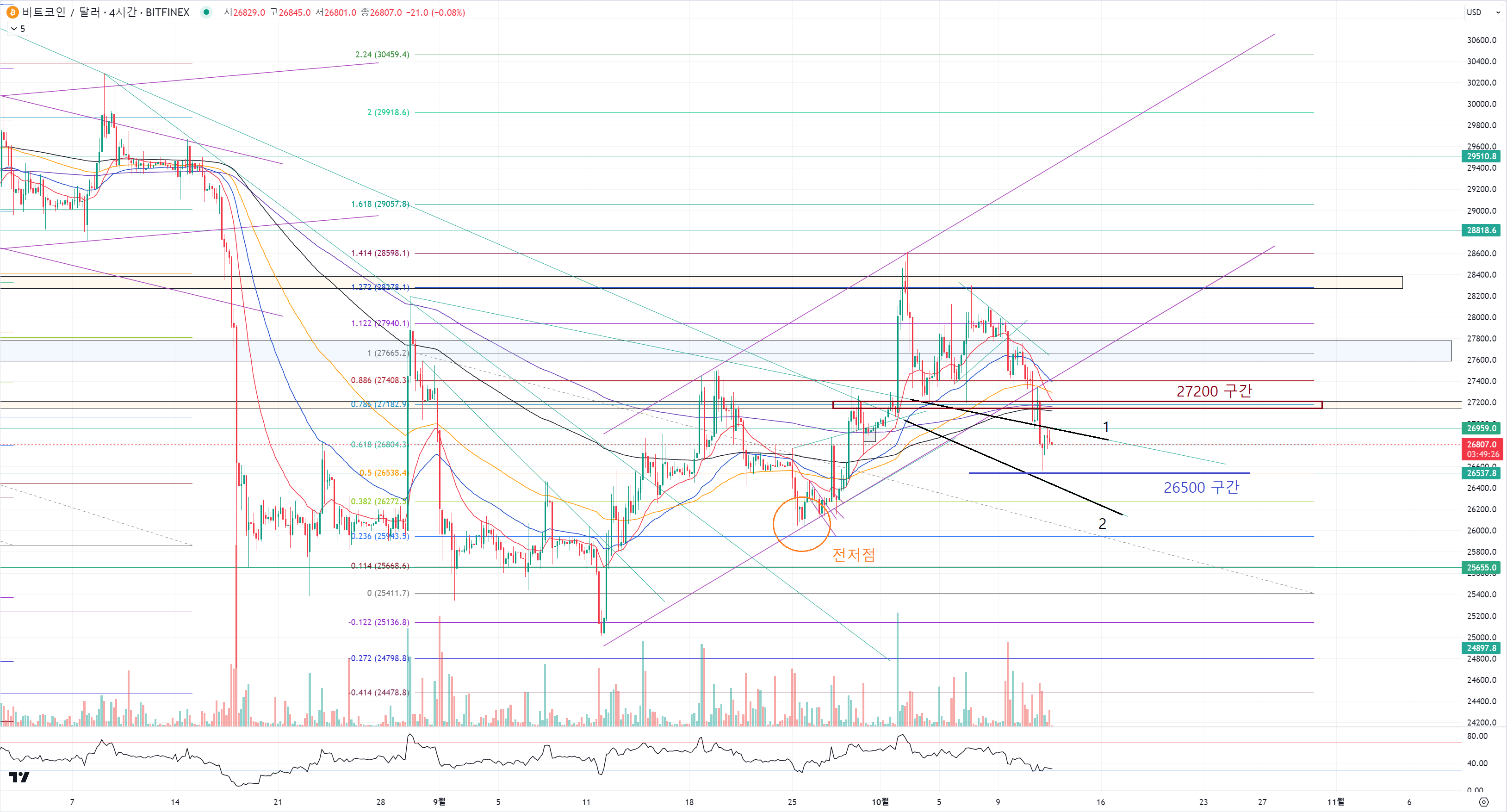 이 경우 26500~27200 사이를 횡보 수렴 이탈 방향을 봐야합니다.