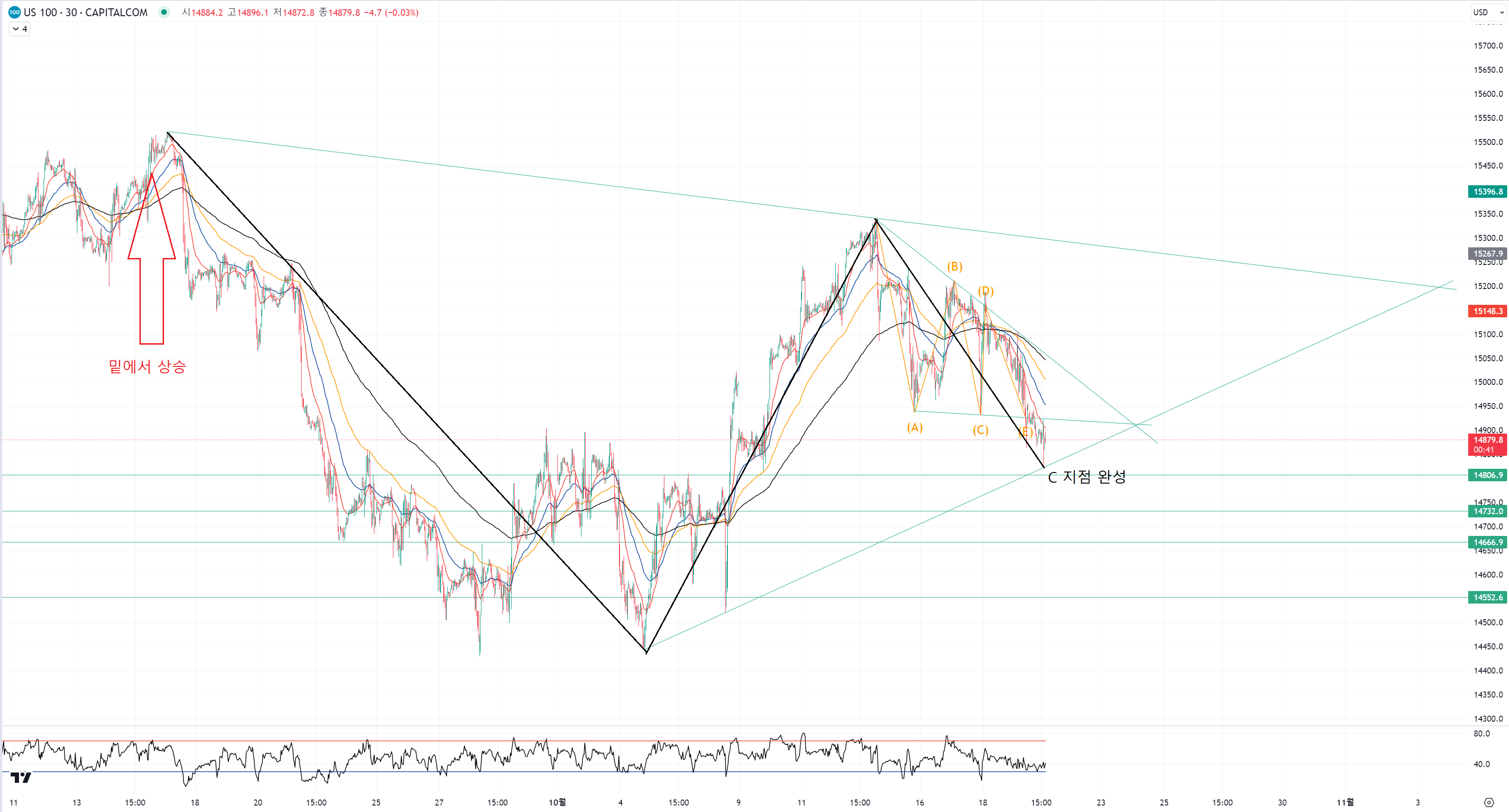 이번에도 고점을 또 갱신 못하면 이 하락에서 E 지점을 목표로 하락추세까지 포함하여