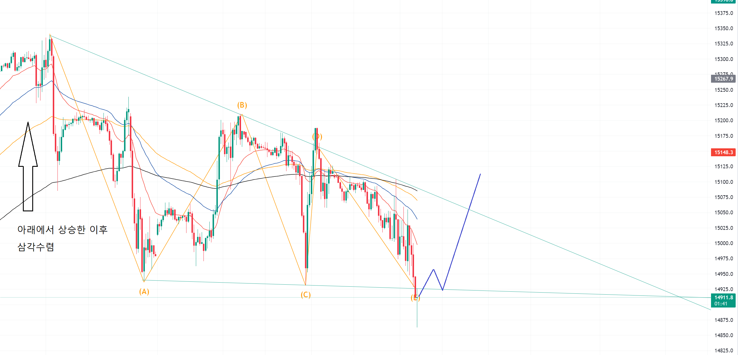 그리고 어떤분이 어센딩 트라이앵글의 E는 윗 추세선에서 끝나고 하락을 기대하는 것 아닌지?