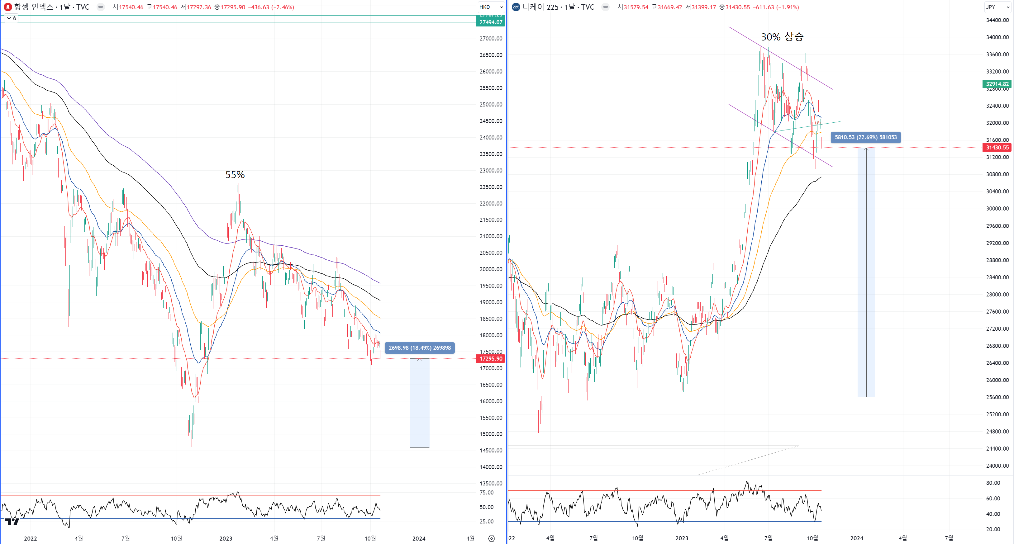 중국과 일본 대표 증시가 2023년에 저점대비 55%, 30%의 상승을 보여줬습니다.