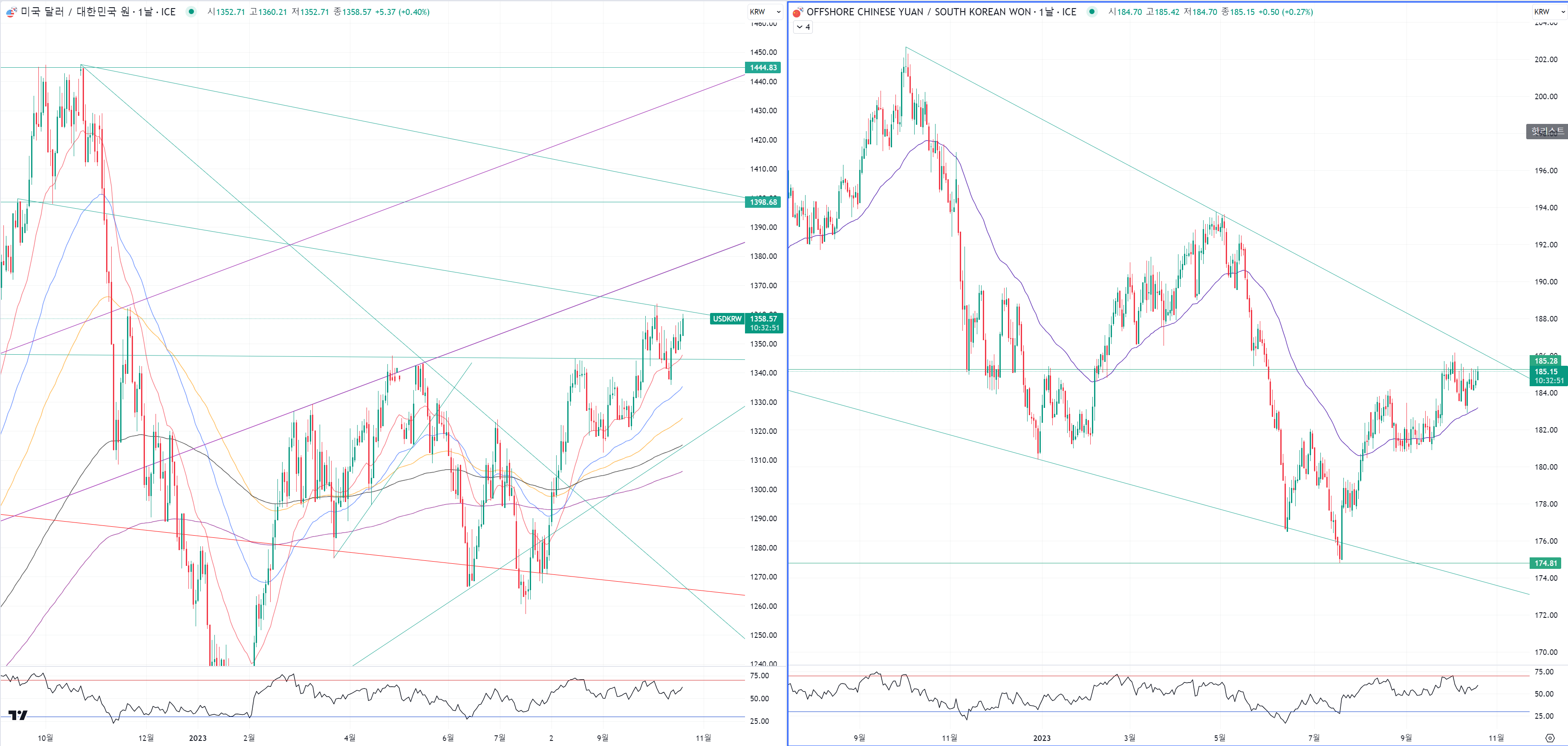 왼쪽은 달라환율이고 오른쪽은 위안환율 입니다.