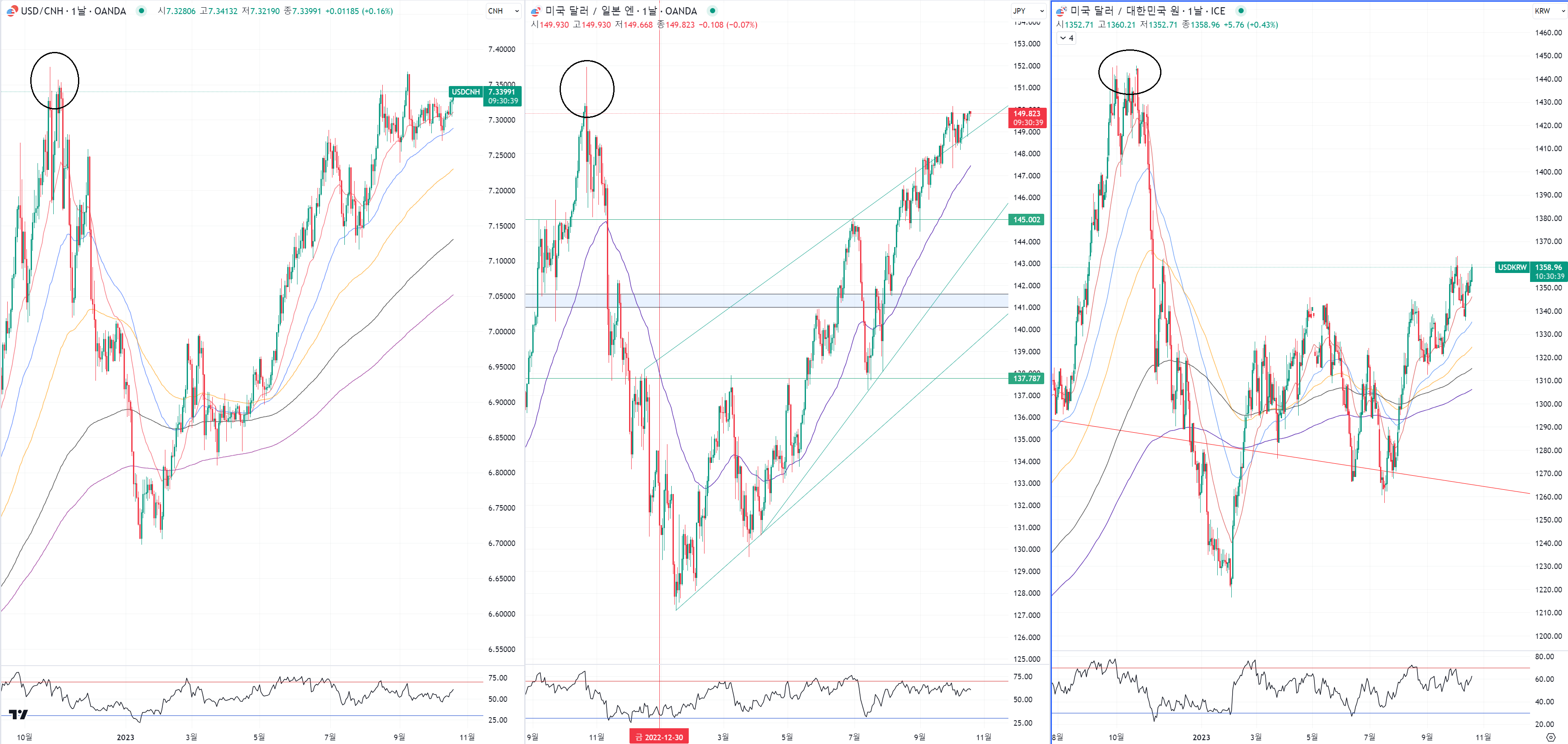 위치를 보시면 아시겠지만 중국과 일본은 이미 환율이 2022년 최고점 근처에 있습니다.