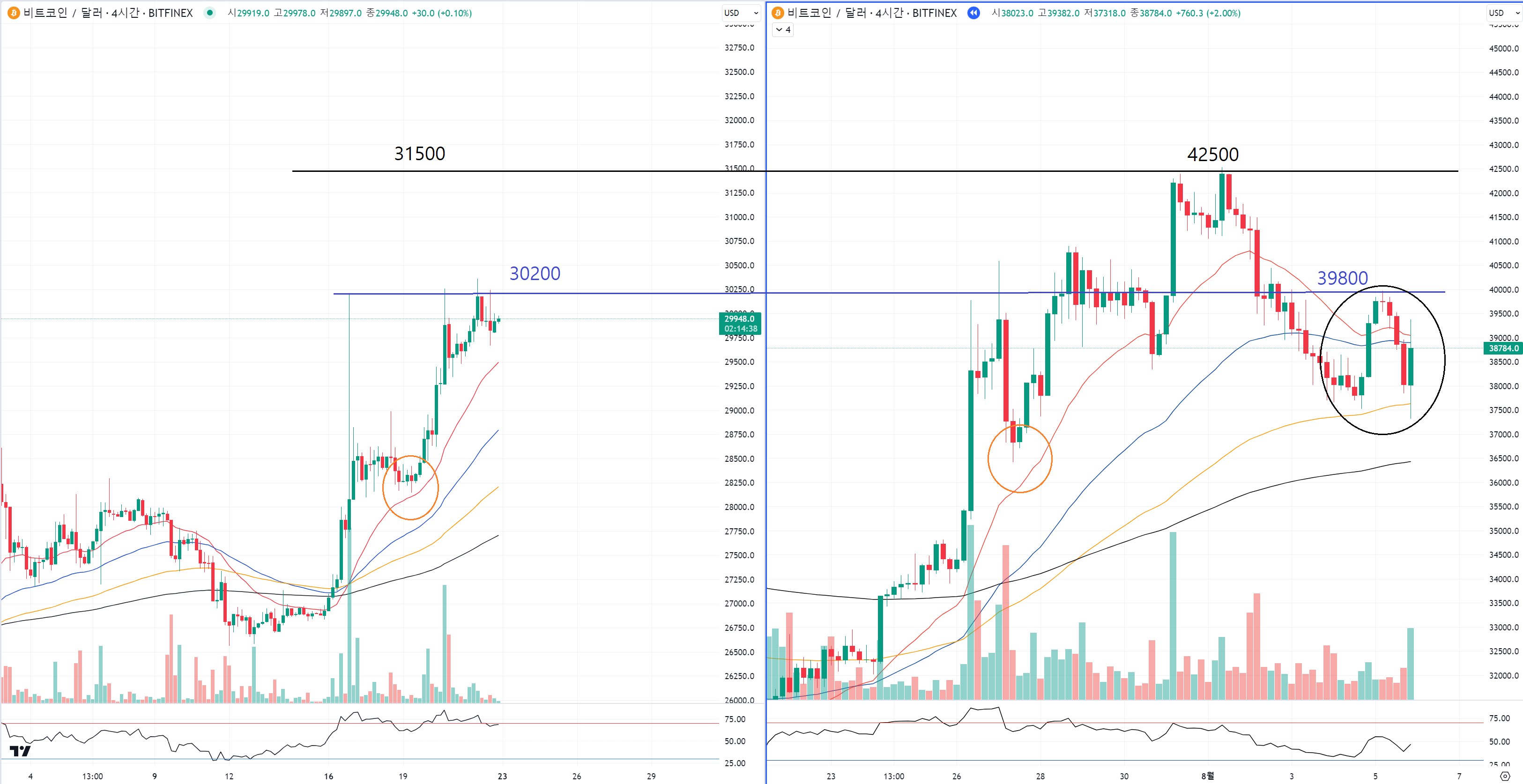 그런데 3개의 차트가 처음에 같은 자리 왔을때는 지지구간이라서 반등이 나왔다면