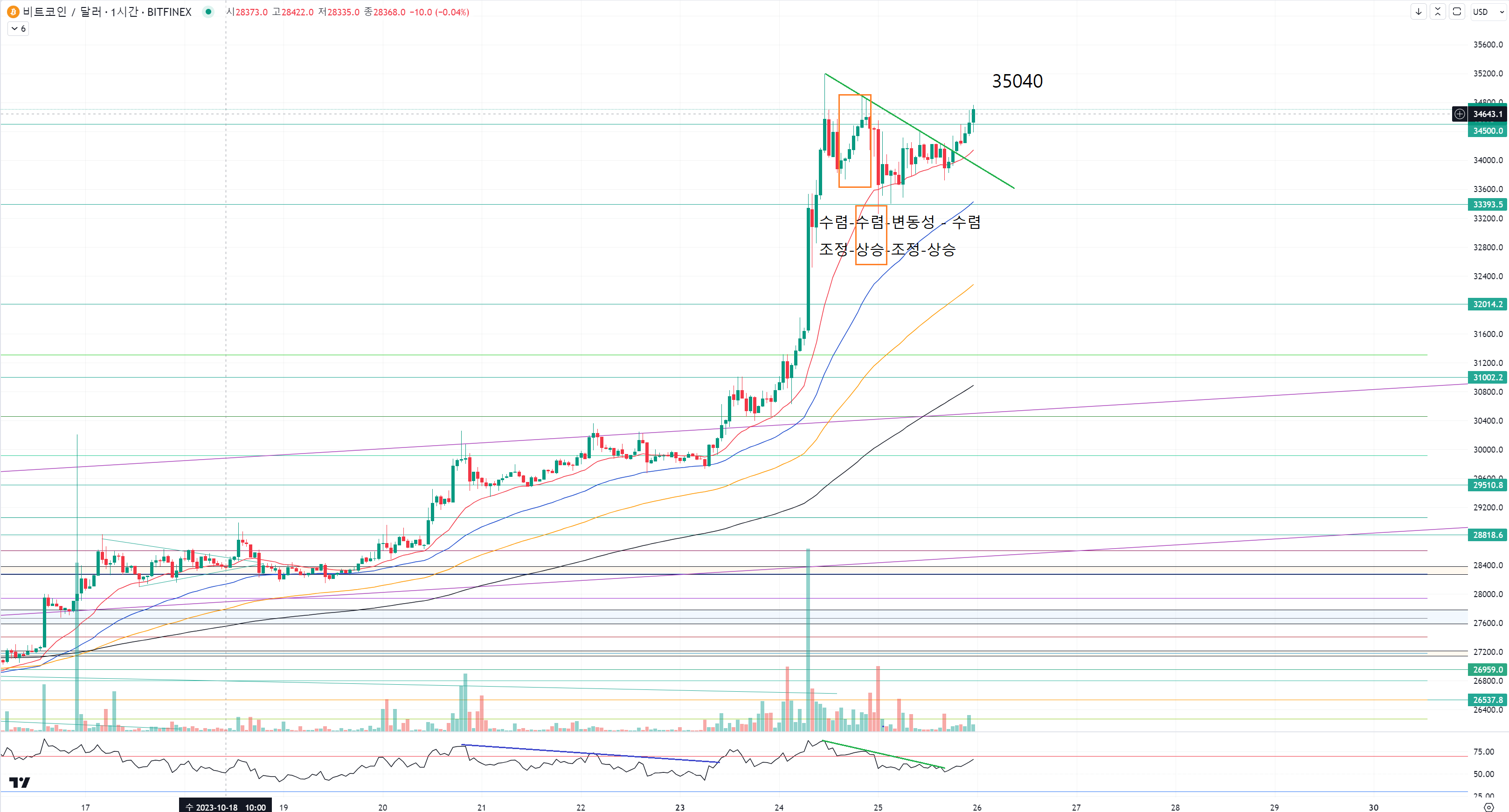 35040이 저항선이라 35000~35050까지는 저항 구간으로 저항 받는지를 확인해야합니다.