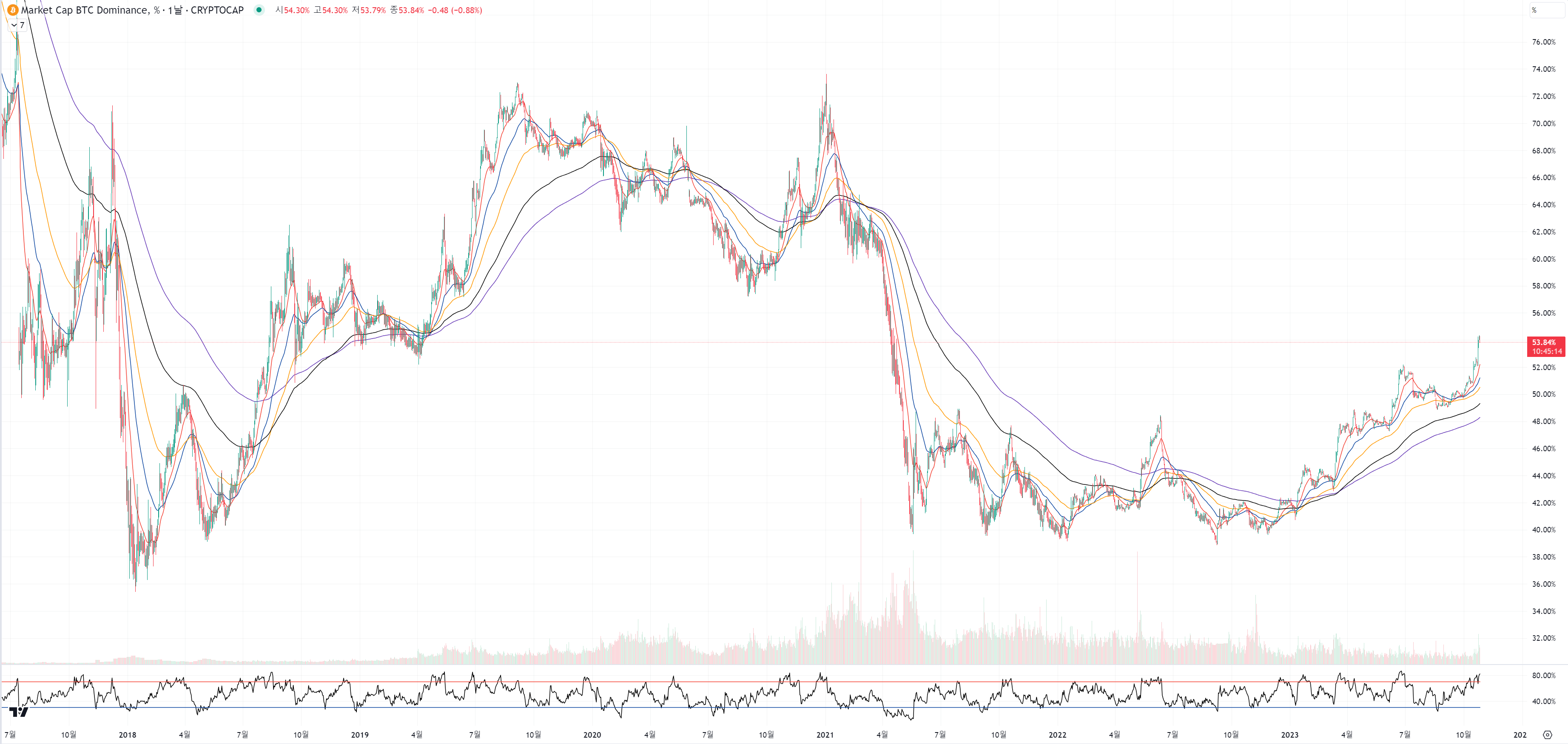 어쨌든 지금 도미넌스 차트가 50~60 사이에서 저항선이 가장 많은 구간 바로 밑에 있기 때문에