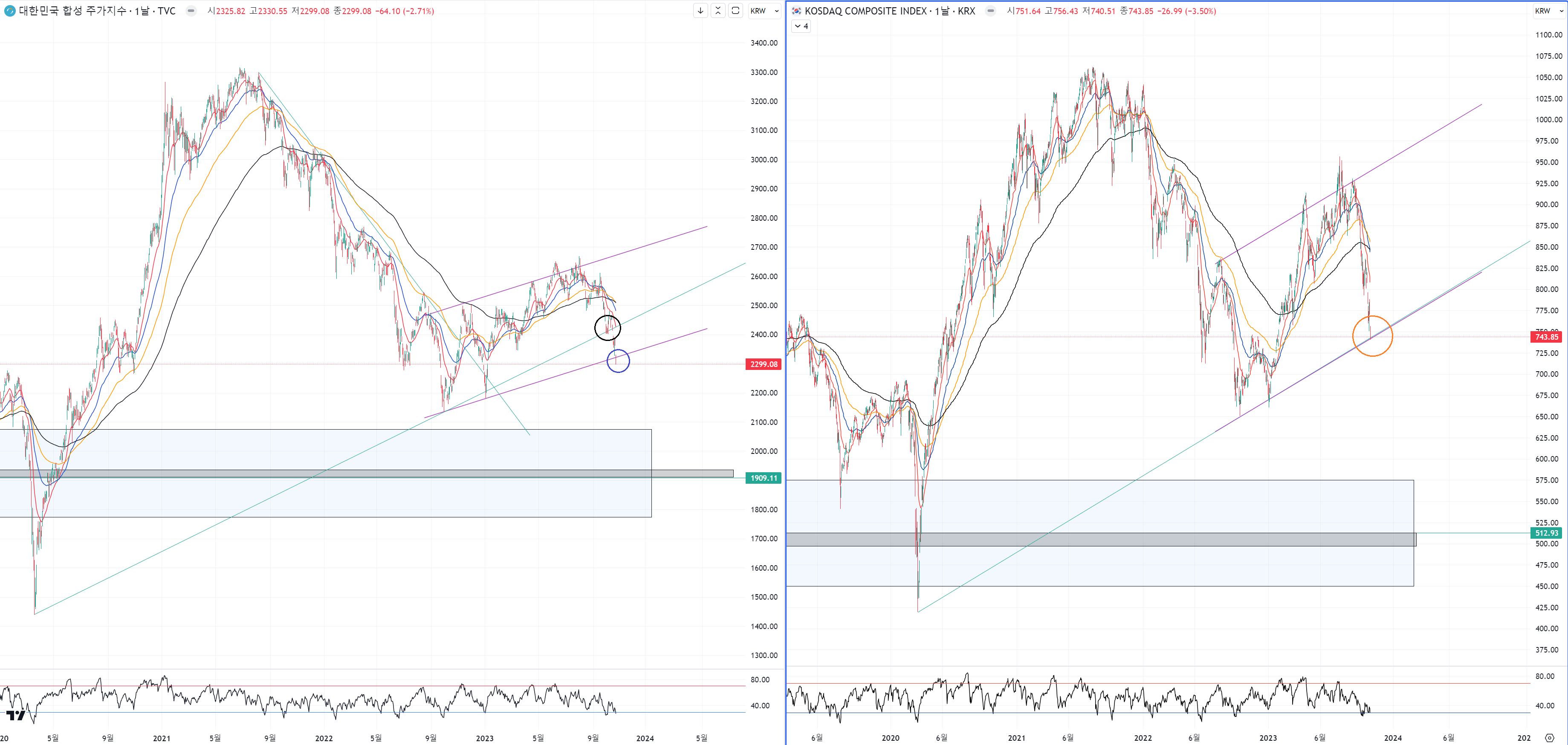 코스닥은 추세선과 평행채널 하단이 겹쳐있는 주황색까지 도달했어요.