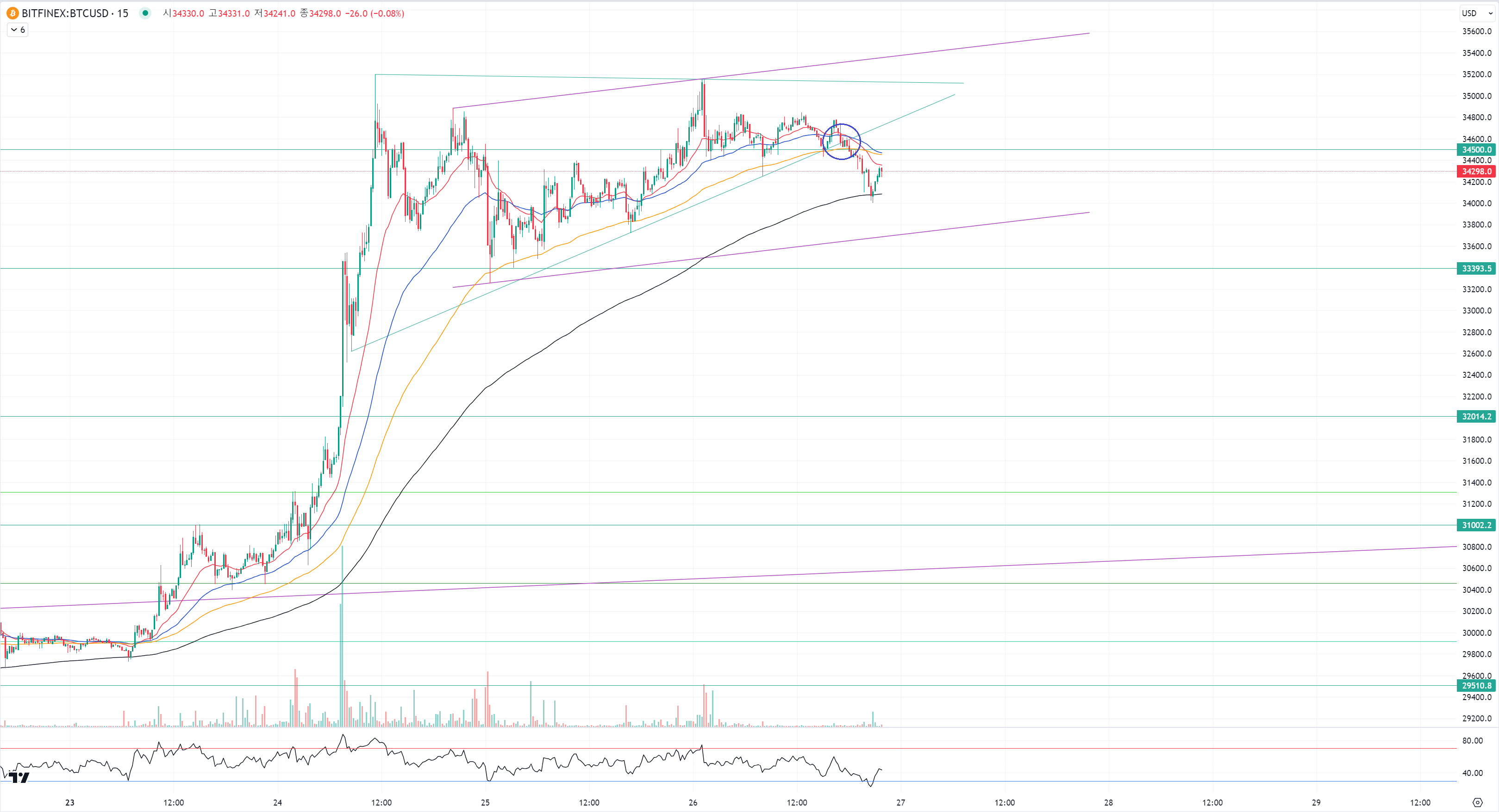 비트코인은 단기적으로 파랑색동그라미에서 추세선 하나 이탈했습니다.
