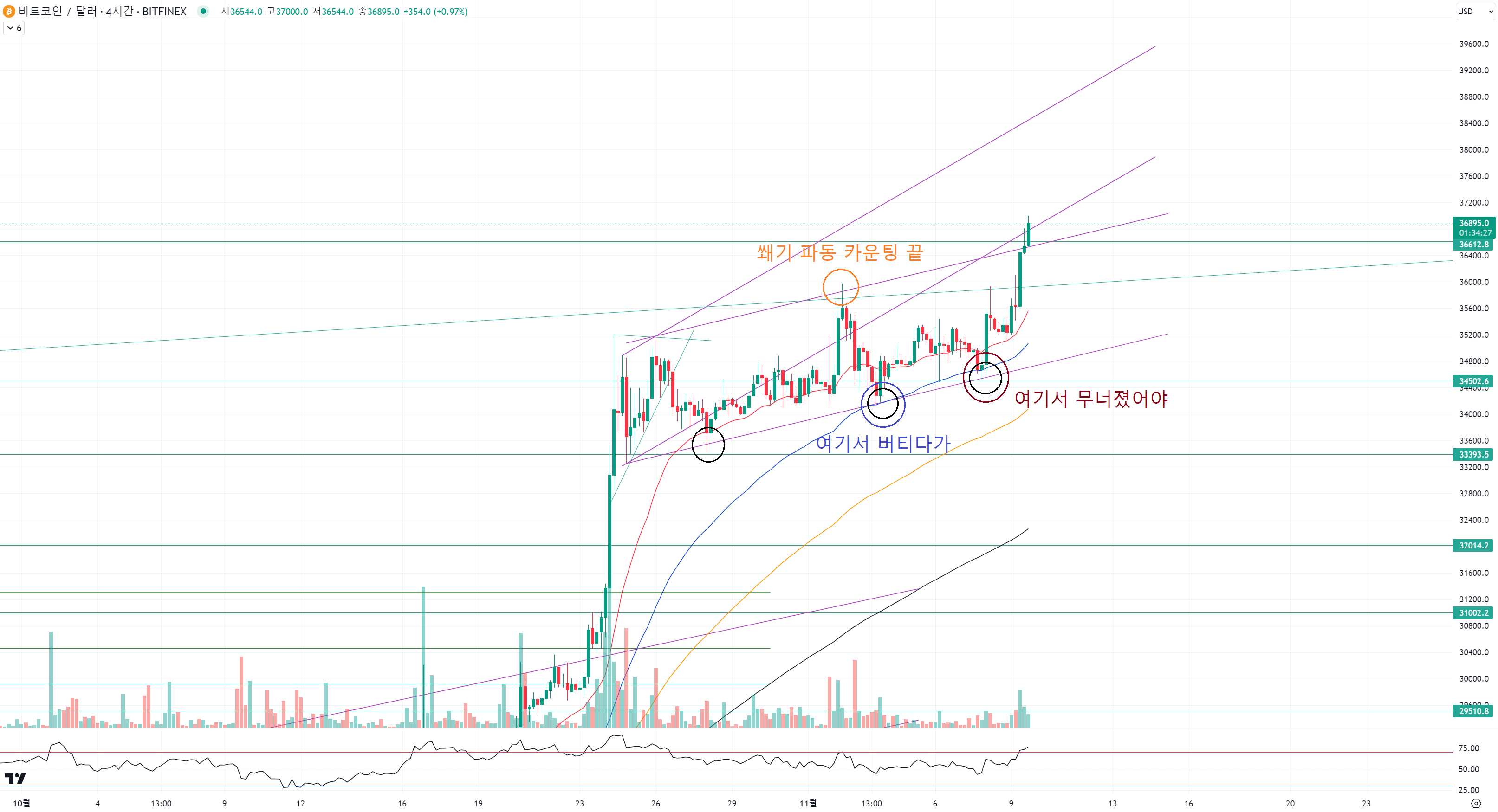 이번에 상승 이후 상승 평행채널을 만들어 주면서 횡보를 해줬어요.