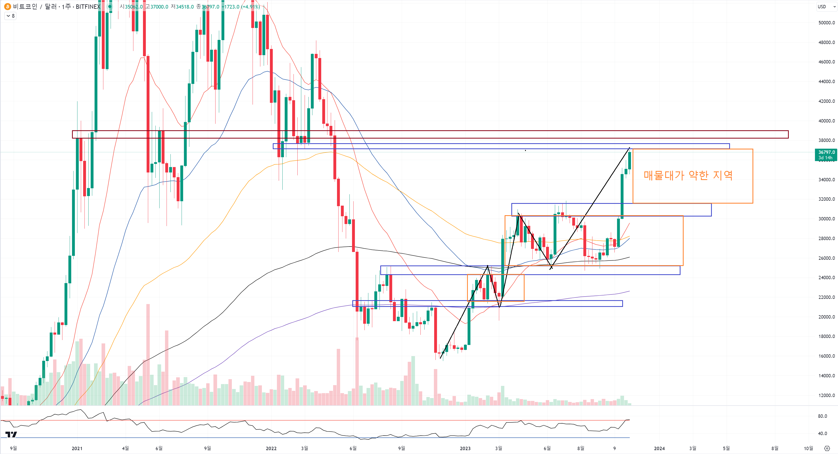 주봉관점을 크게 보면 2023년 비트코인 차트는 단순했습니다.