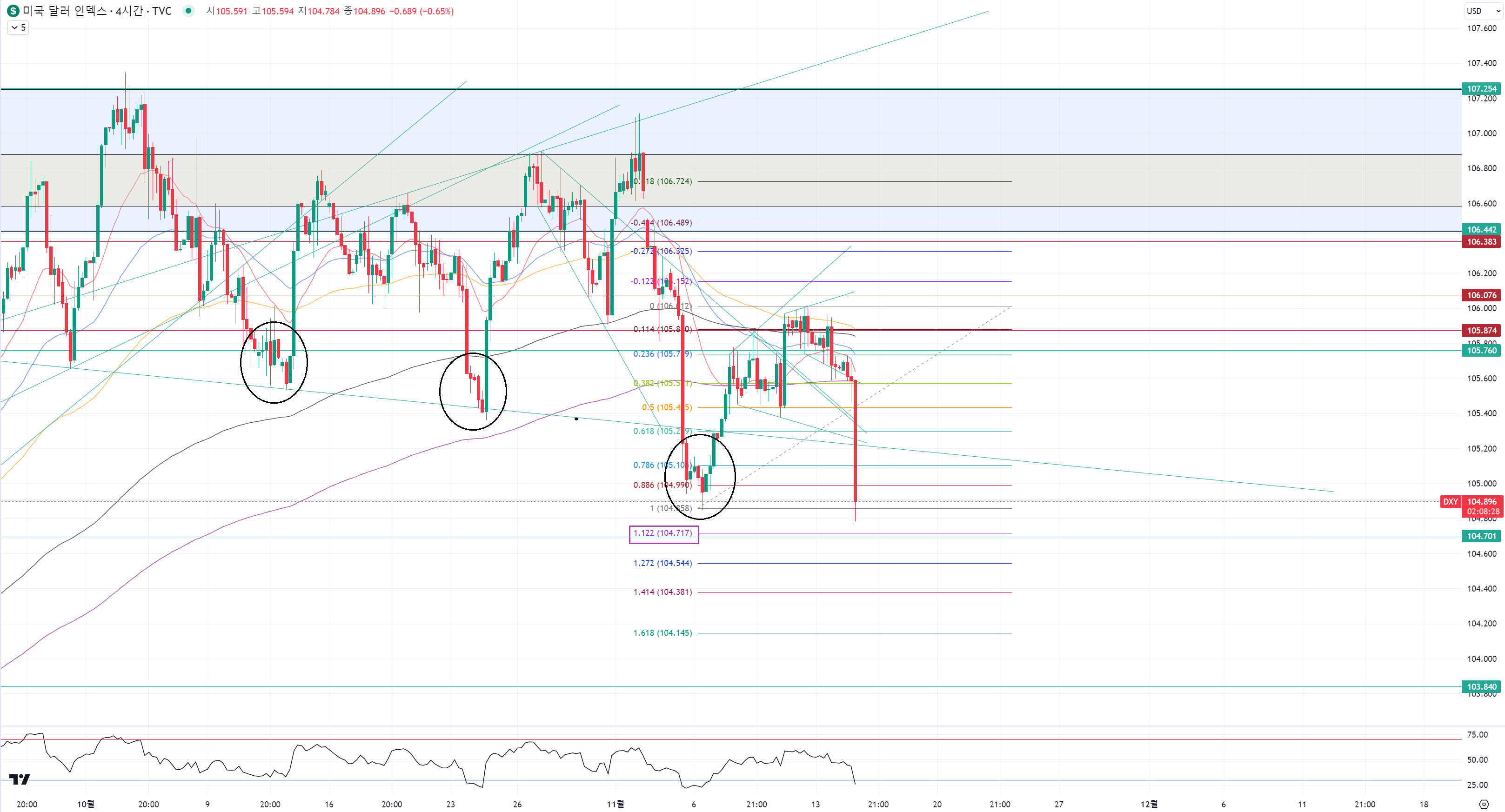 지난주에는 105.57 저항을 확인해서 이번주는 하락세를 기본적으로 보는 상황에서