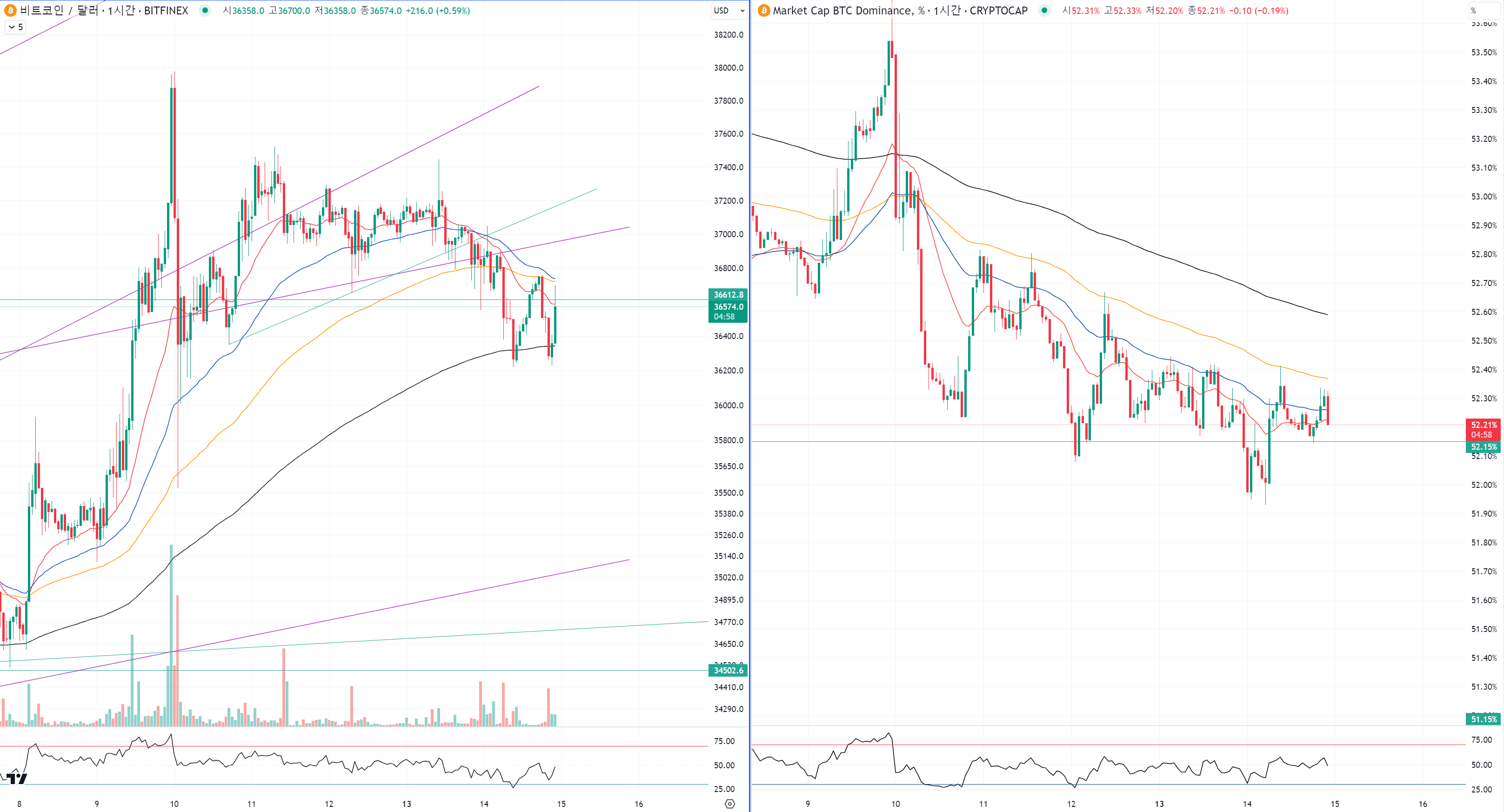 일단 비트코인은 특별한 매수세가 안보이고 횡보에서 추세선을 단기적 매도 강세를 보시면서