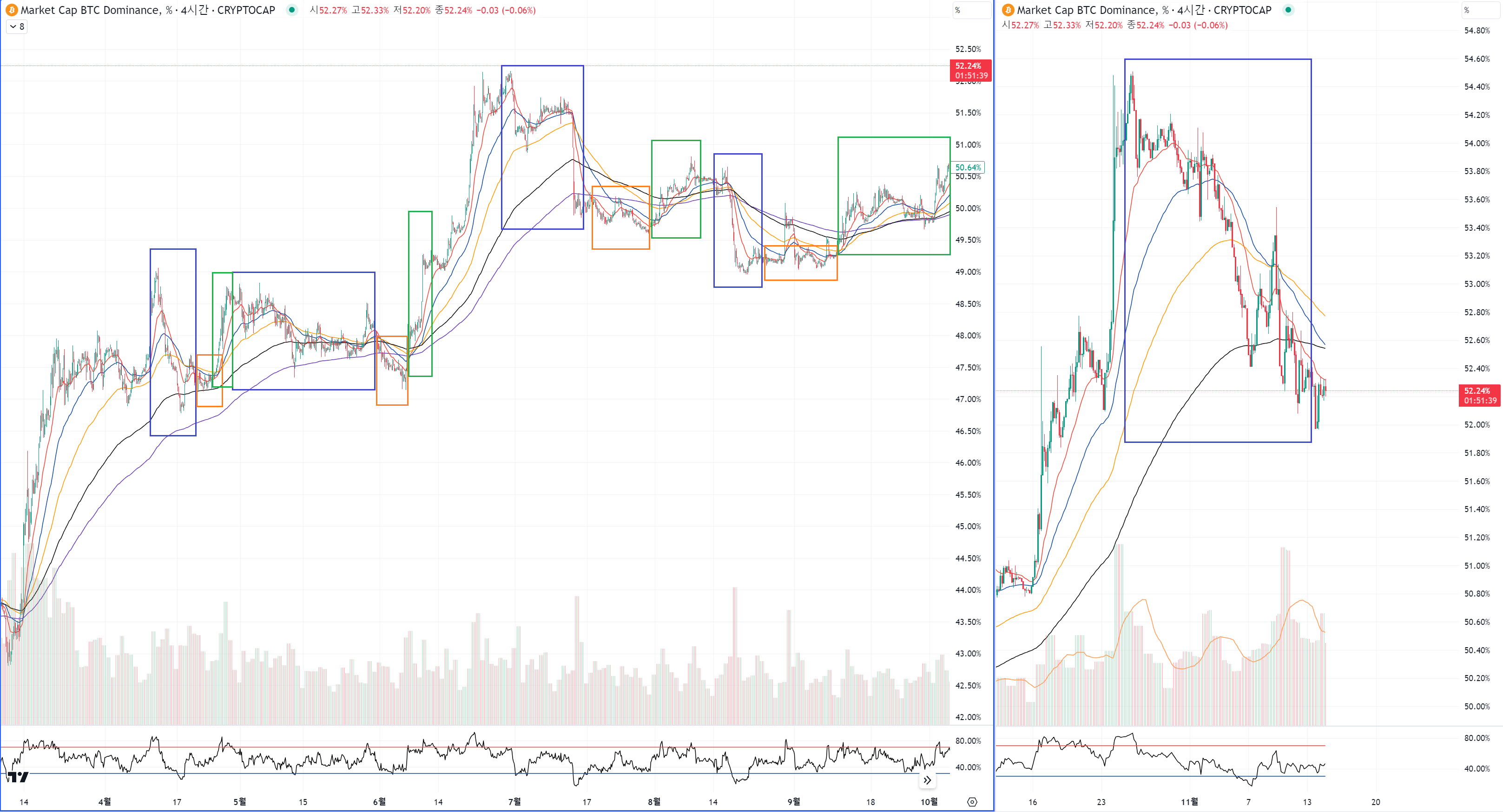 그러면 다시 초록색구간처럼 도미넌스가 상승을 하는데
