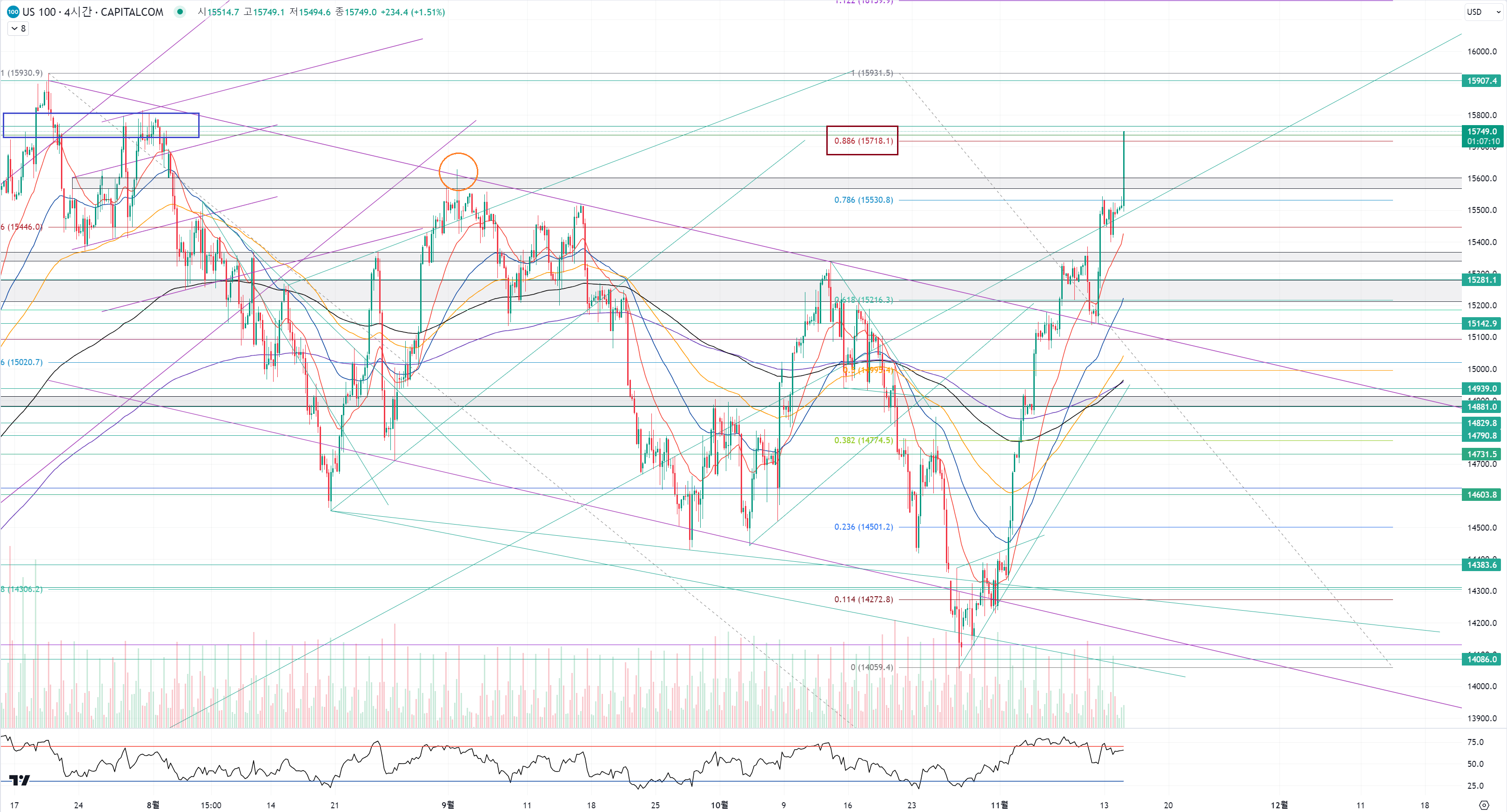 피보나치 비율 0.886과 함께 7월에 만들어준 파랑색 구간의 꼬리 저항 구간에 도달했습니다.