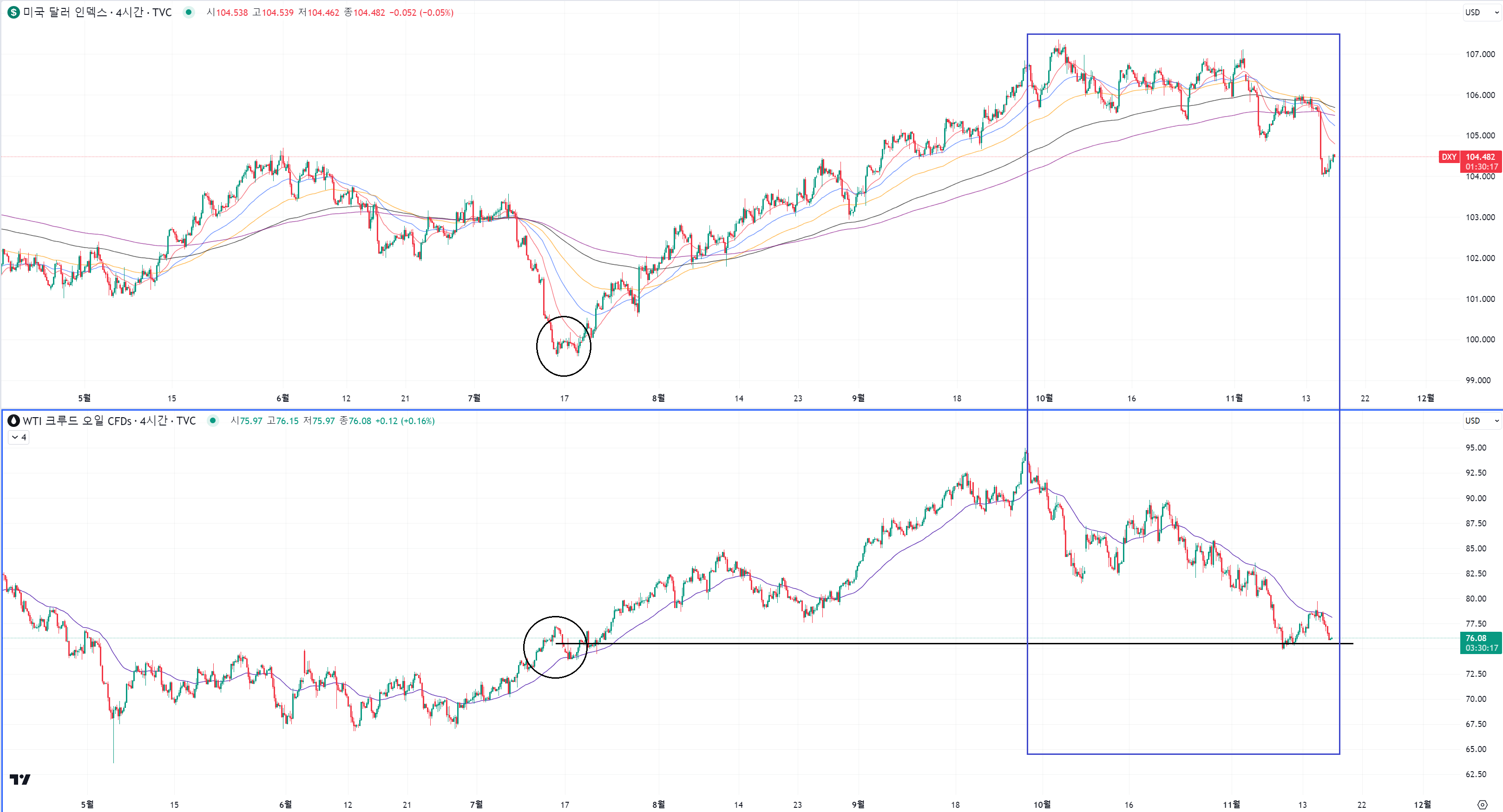 골드가 변동성을 준 파랑색 시기에 오일도 변동성이 나왔습니다.