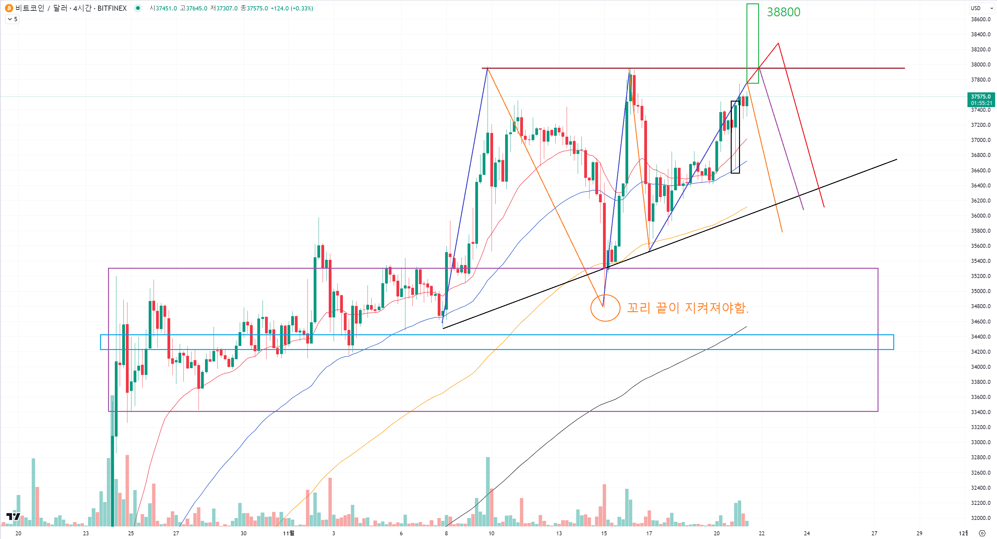 지금 위치에서는 고점을 장대양봉으로 갱신하면서 38800정도까지 한번에 가주는 것이 아니라면