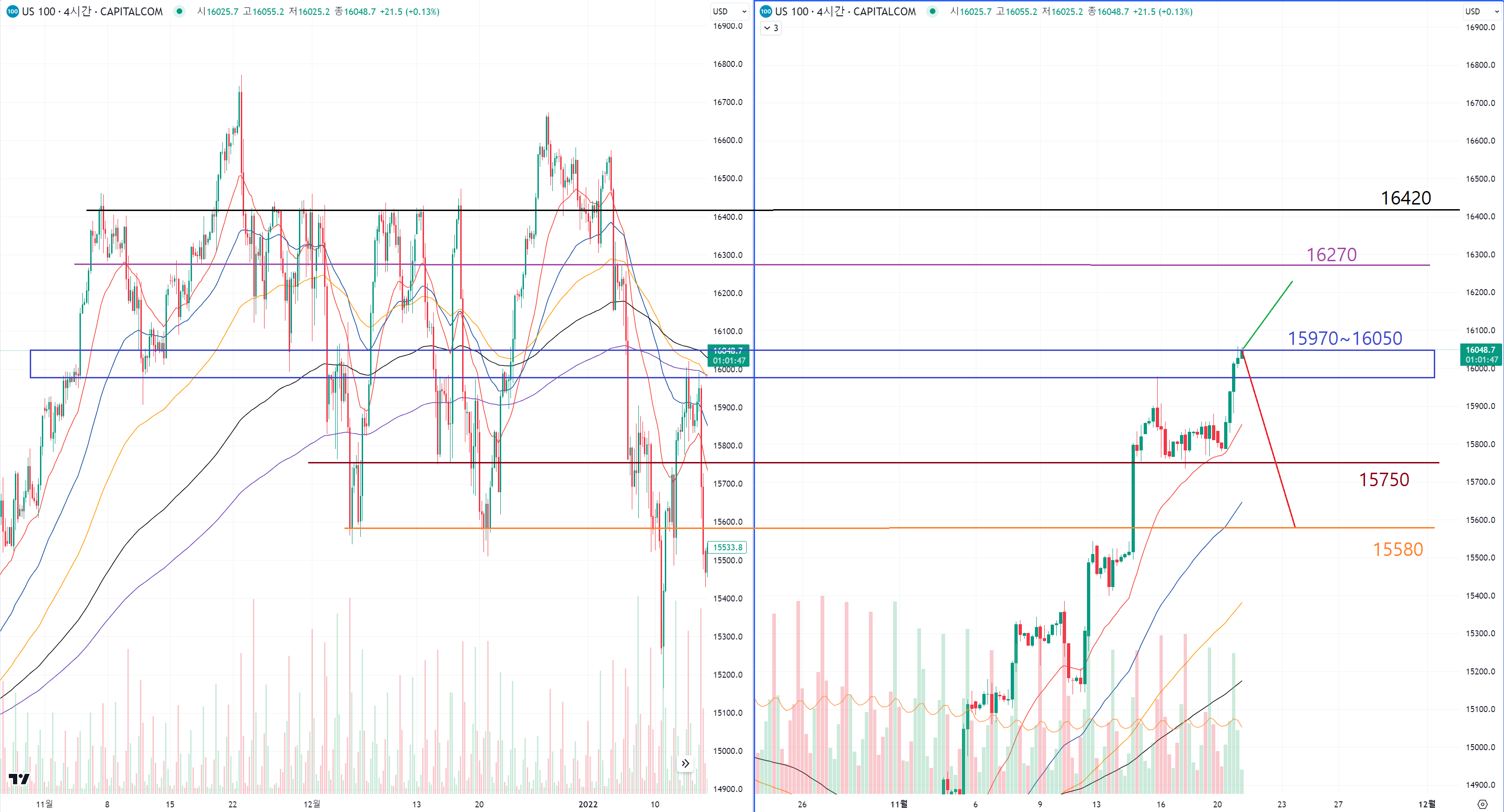 나스닥의 경우 2021년에 통곡의 벽으로 부르면서 저항으로 계속 만들어준 매물대가 있습니다.