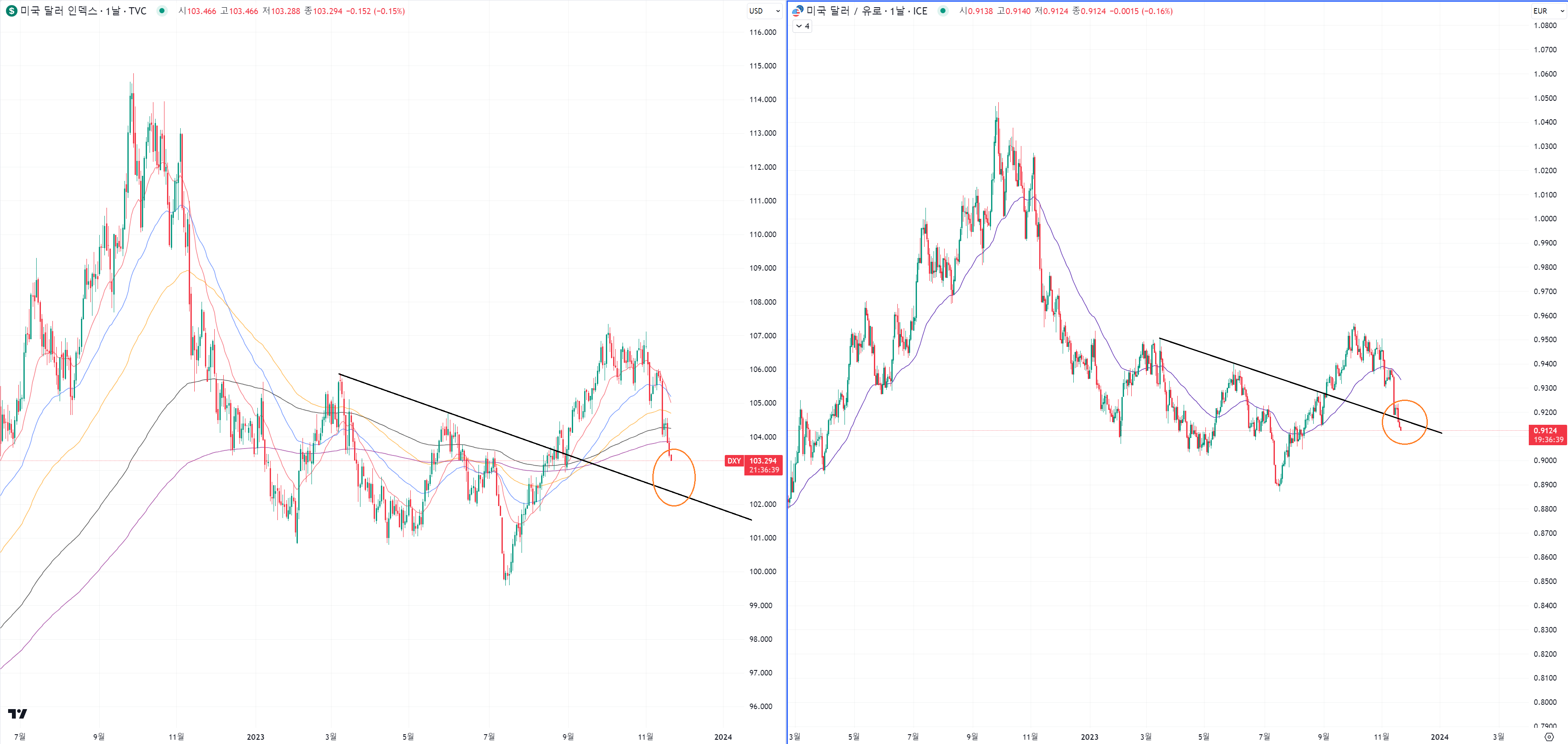 달라유로 차트가 달라인덱스보다 매도세가 더 강합니다.
