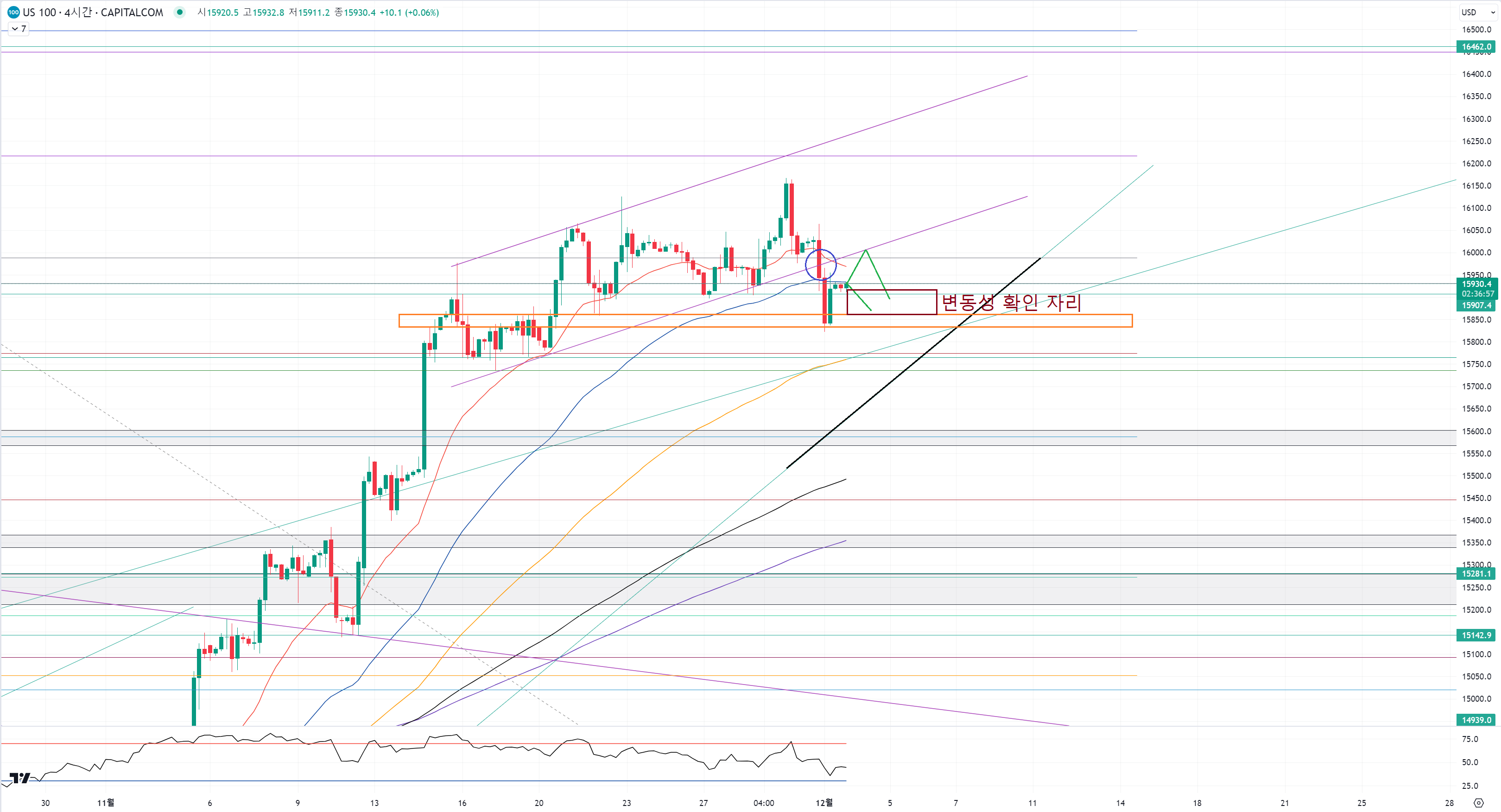 나스닥은 파랑색 동그라미에서 평행채널 하단에서 밀려났습니다.