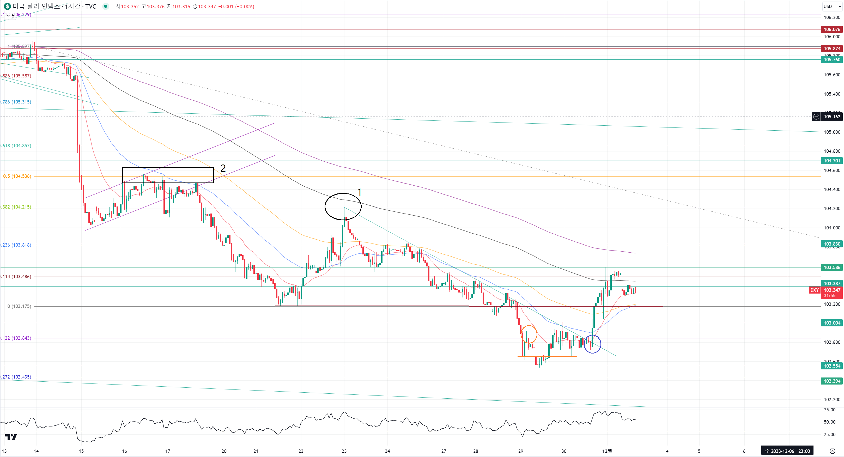 이 부분에서 달라가 103.1~2의 지지를 확인하는 지점에서 버텨준다면