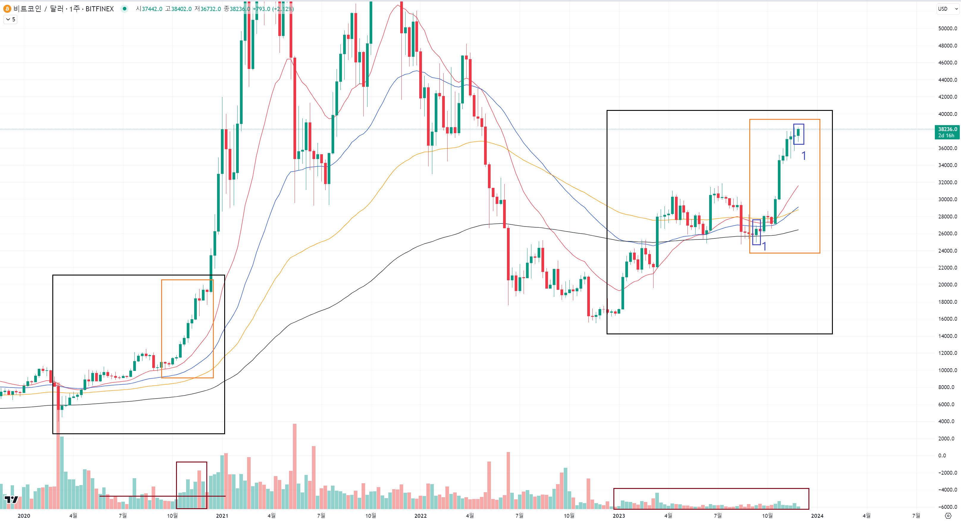 2023년 상승하는동안 거래량 변화가 없는건 비교할 의미가 있습니다.