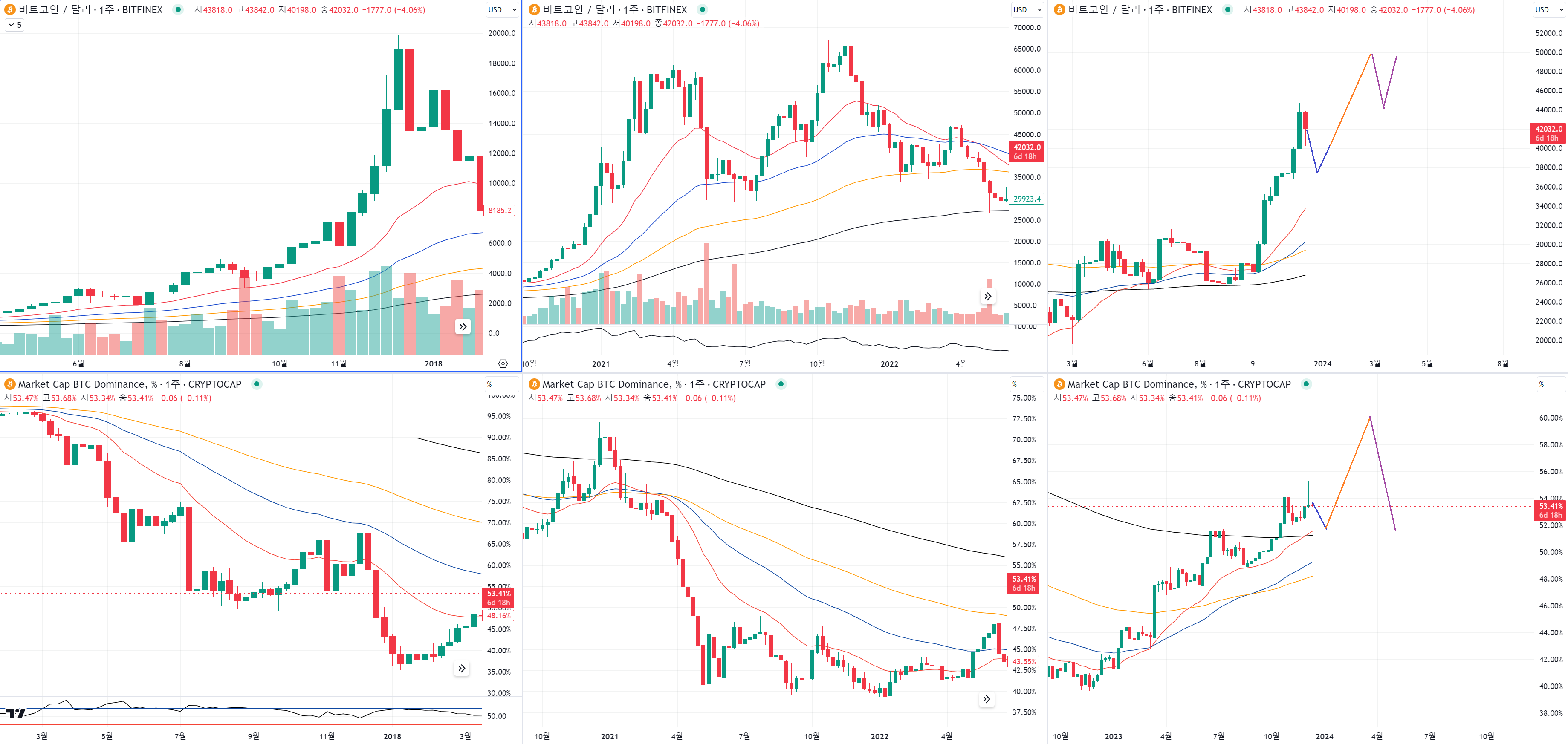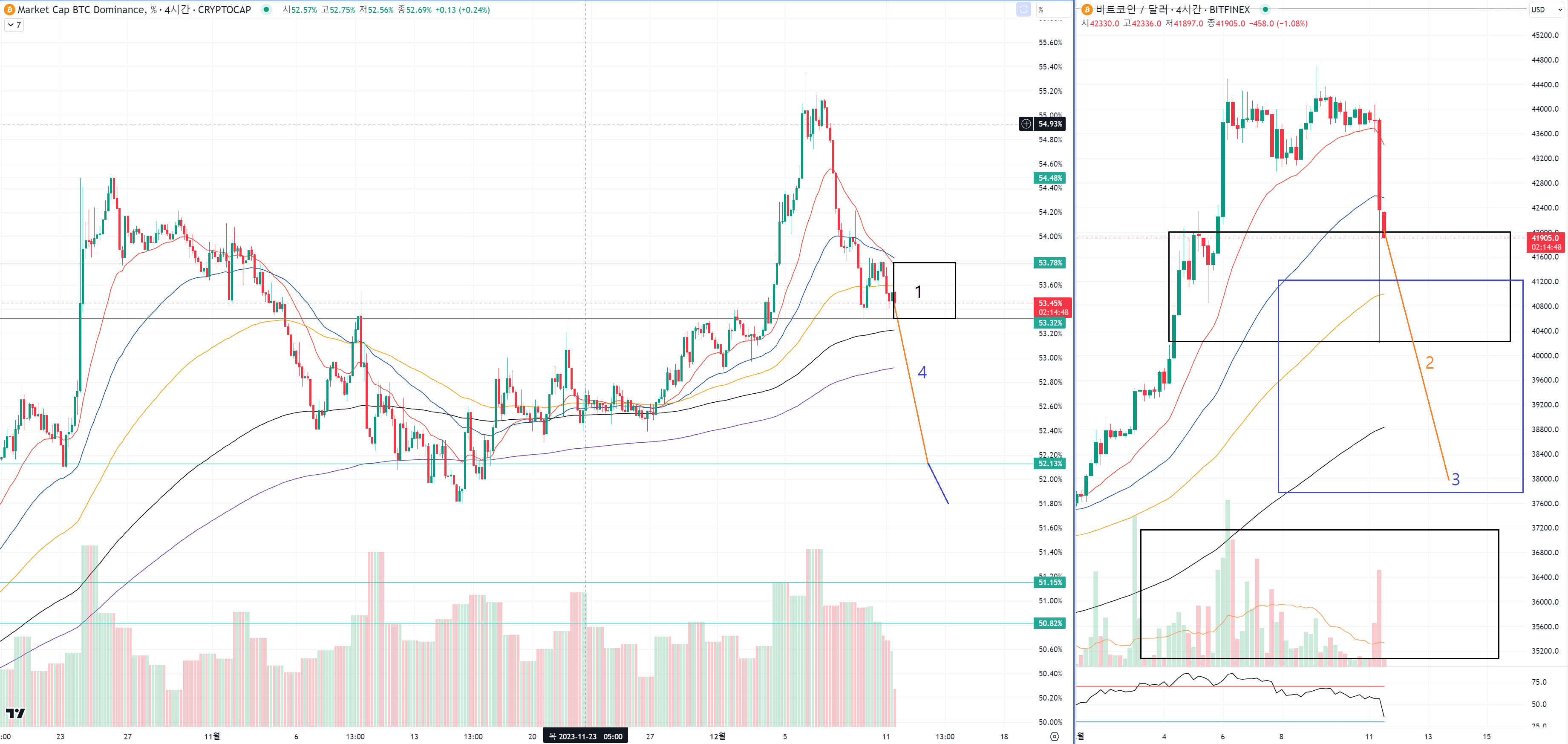 도미넌스는 4번 주황색선처럼 내리며 알트코인 마지막 펌핑을 해주는거예요.