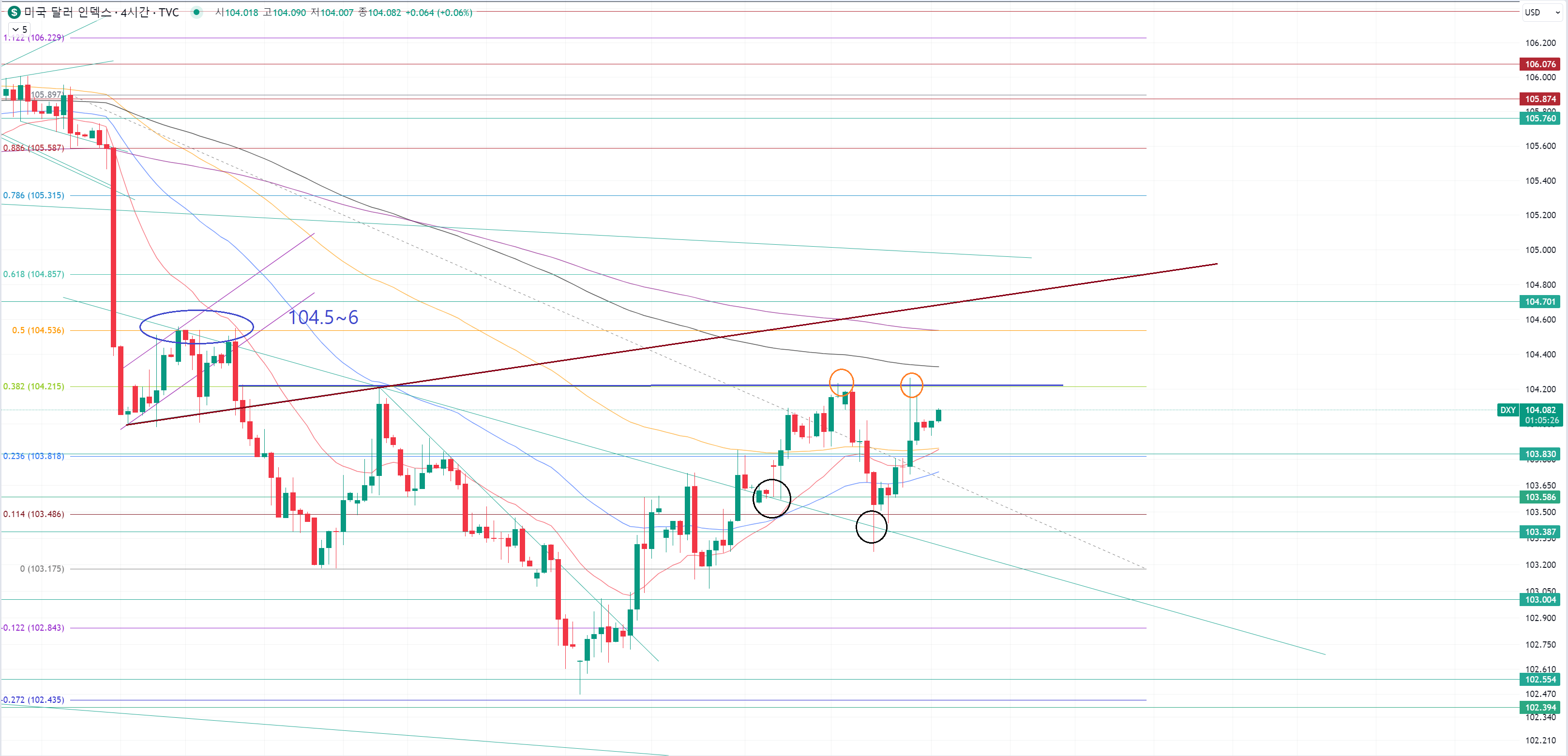 이번에 돌파하게 되면 다음 목표지점은 파랑색 동그라미 104.5~6인데