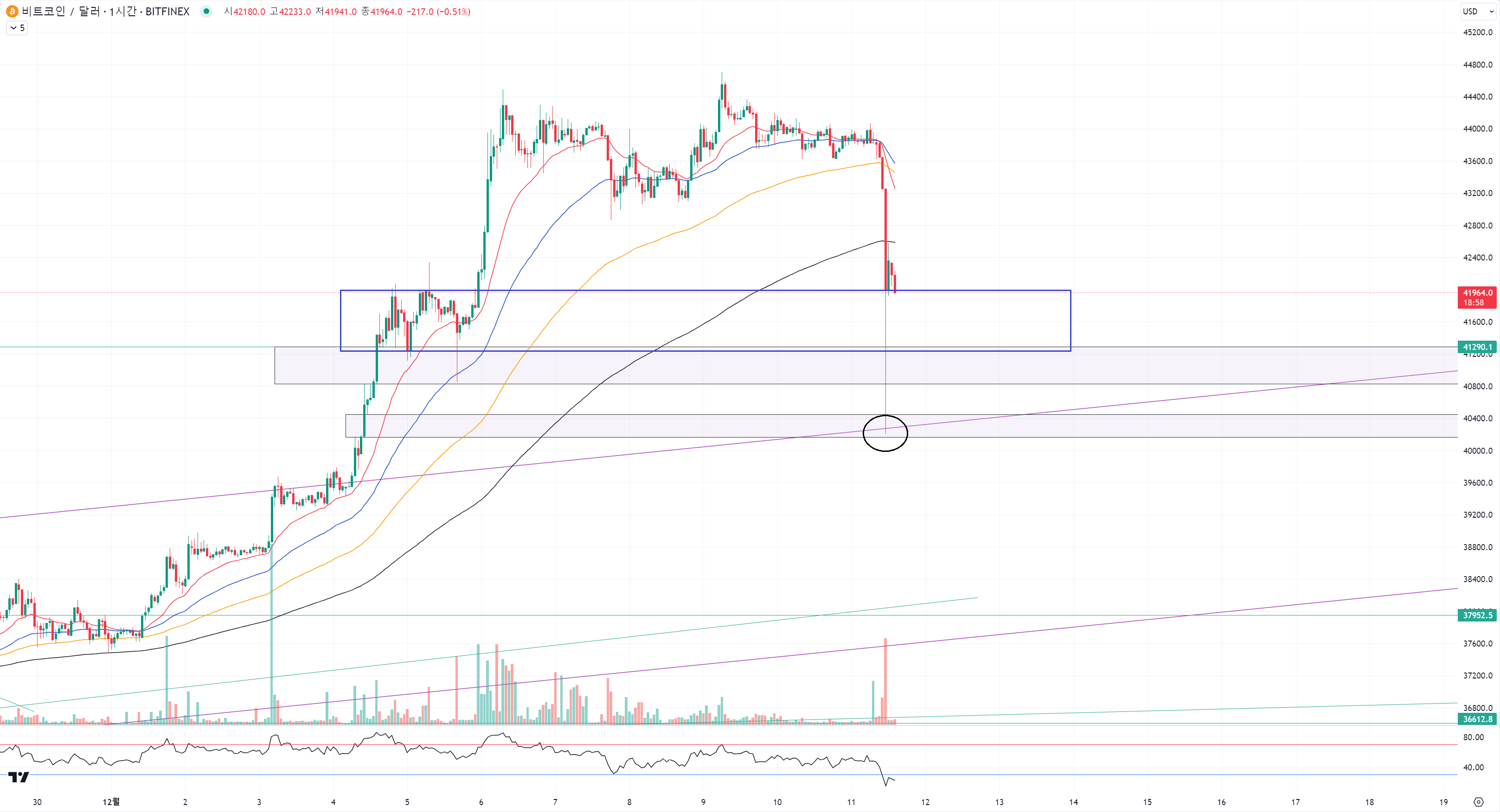지금 위치가 이미 42500 아래에 있기 때문에 여기서는 횡보를 해주면 안되는 구간이예요.