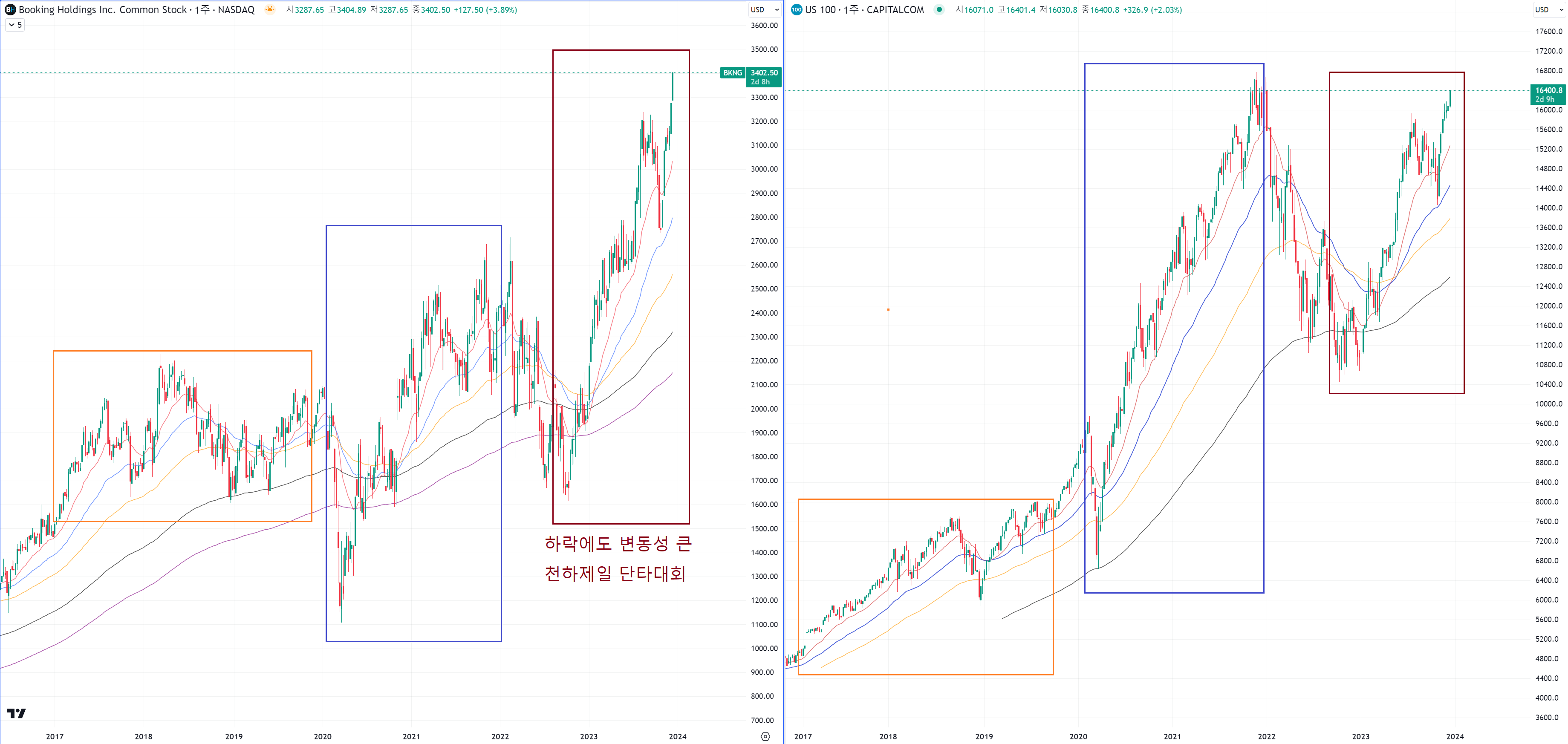 왼쪽이 부킹홀딩스이고 오른쪽은 나스닥입니다.