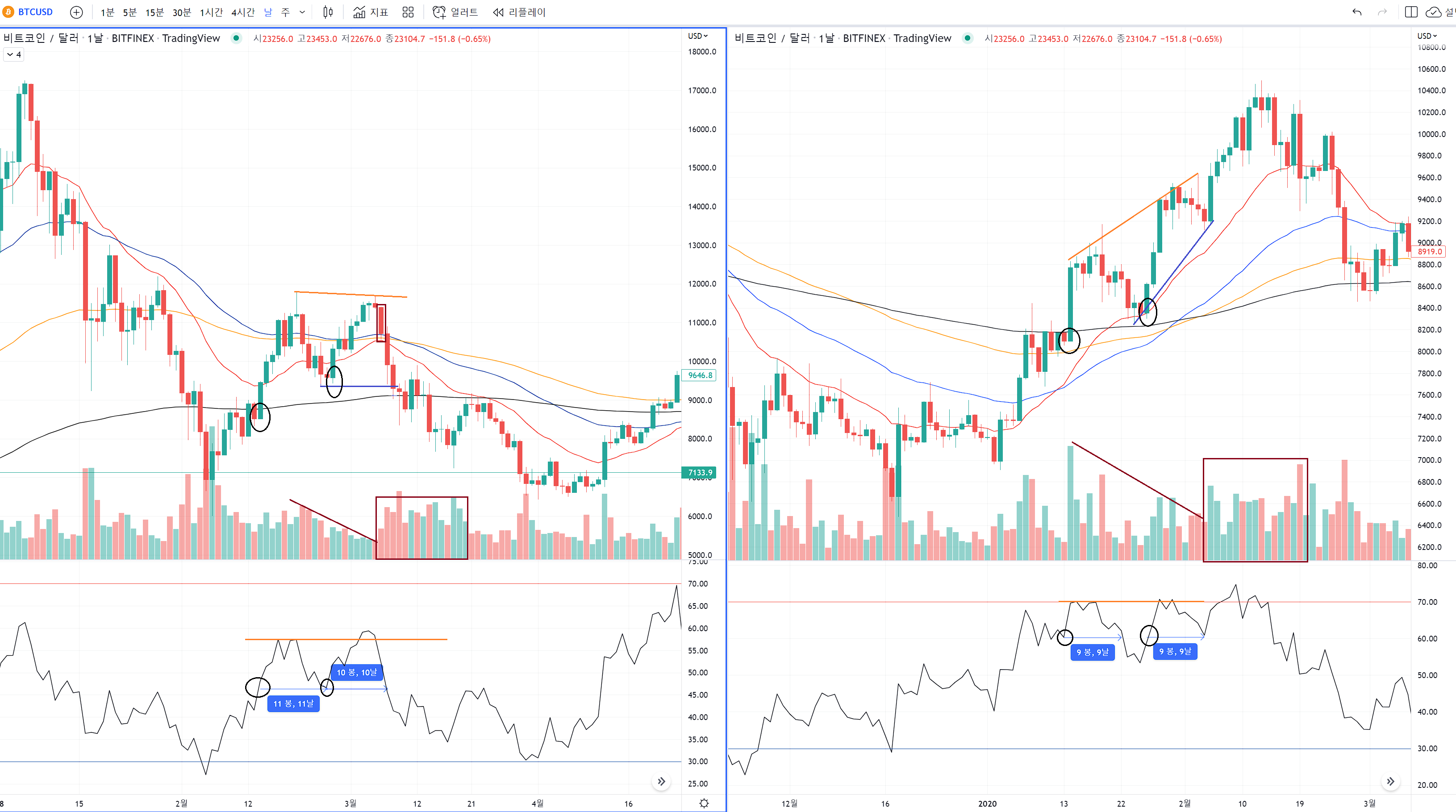 그런데 rsi의 저점이 같아지는 시기가 거의 비슷했습니다.