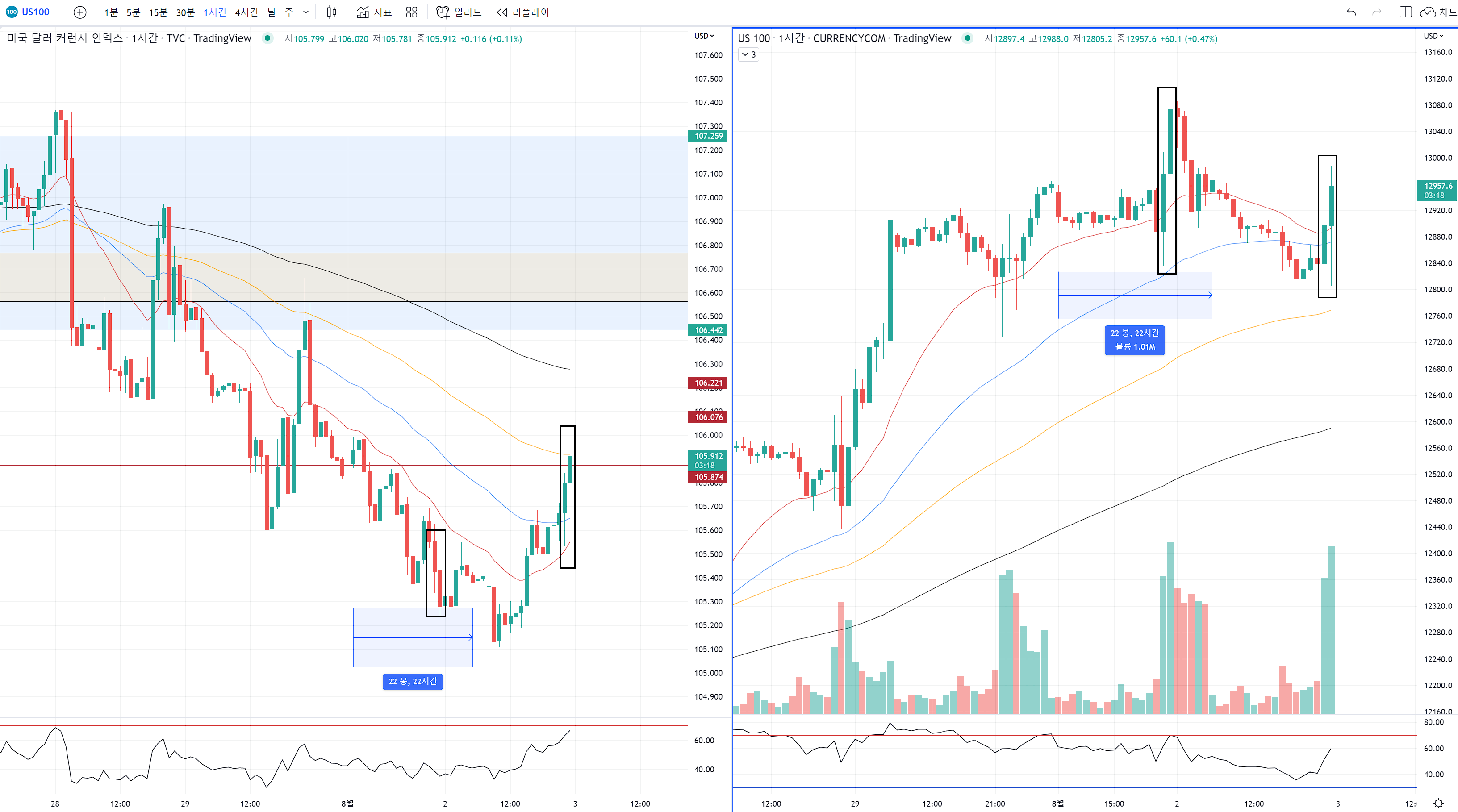 왼쪽은 달라차트 이고, 오른쪽은 나스닥 차트입니다.