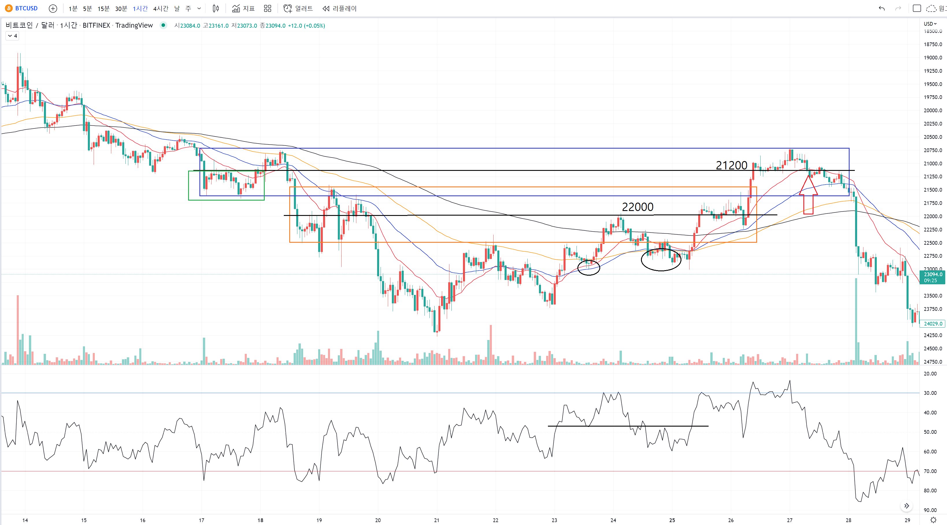 잠시나마 파란색 구간인 23000~23800 구간에서는 매수를 진입하면 안되는 상황이 오는거예요.