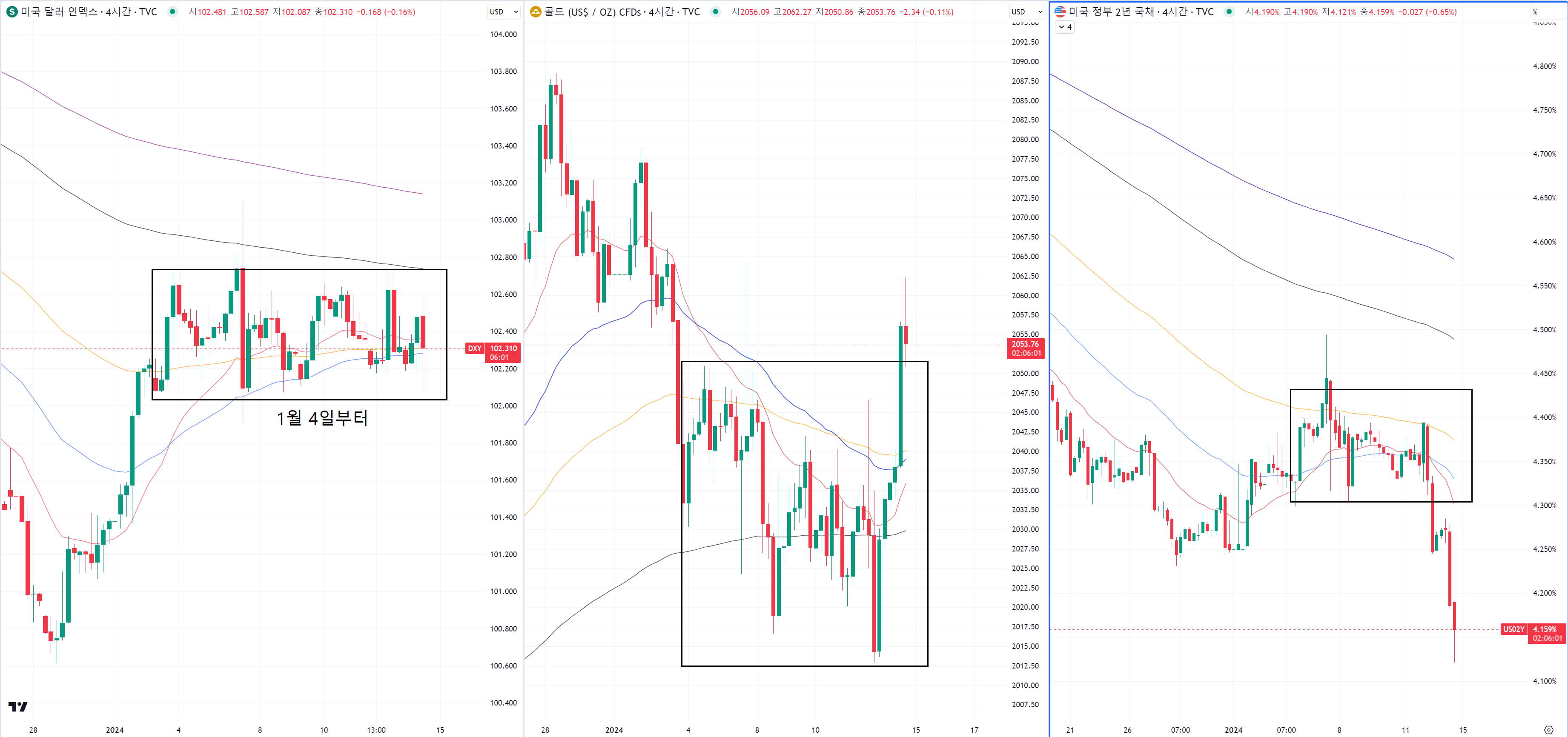 미국 채권 금리는 달라와 마찬가지로 횡보를 하다가 11일 미장 열린 이후 갑자기 하락이 나왔어요.